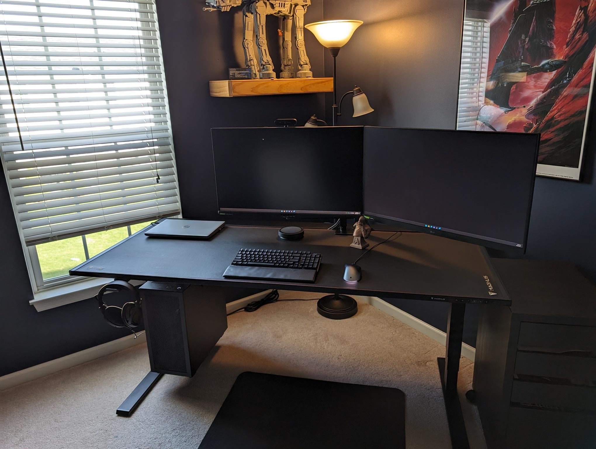 Rewired and reposition my WFH/Gaming Setup today. Secret Lab Magnus Pro. There’s a USB 3.0 switch that’s attached to the left side of the desk allowing me to switch between my work laptop and my gaming PC. More pictures here: https://imgur.com/a/ZyUAZHE