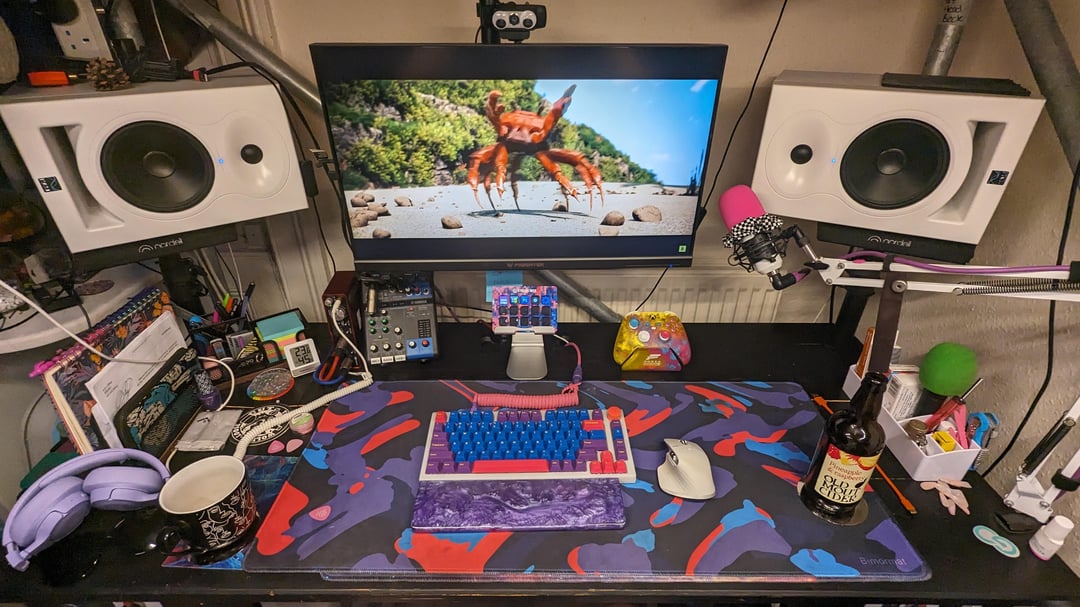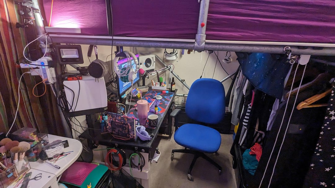My gaming/music/office set-up that I keep under this bed I made from handrail and fittings that also doubles as my wardrobe. (Renting a single room and space is precious).