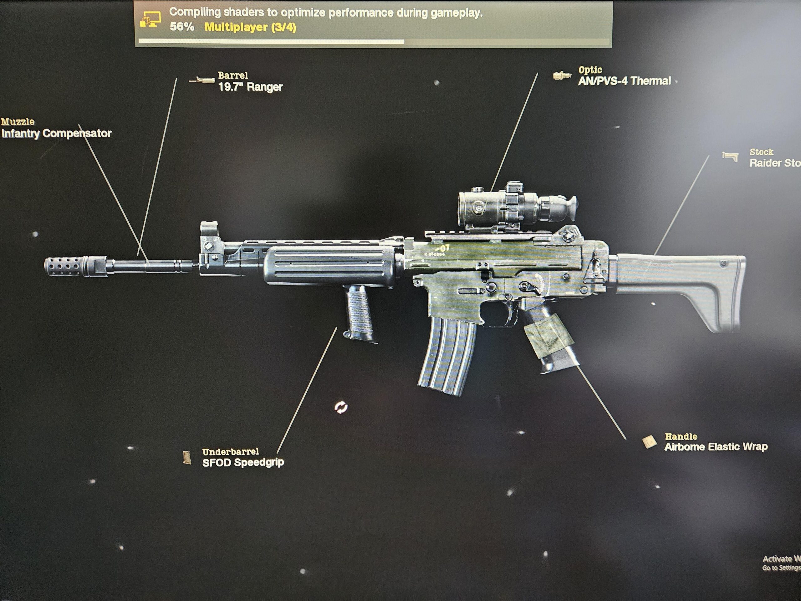 Infantry Compensator, SFOD Speedgrip, Airborne Elastic Wrap, Raider Stock, AN/PVS-4 Thermal, 19.7 Ranger