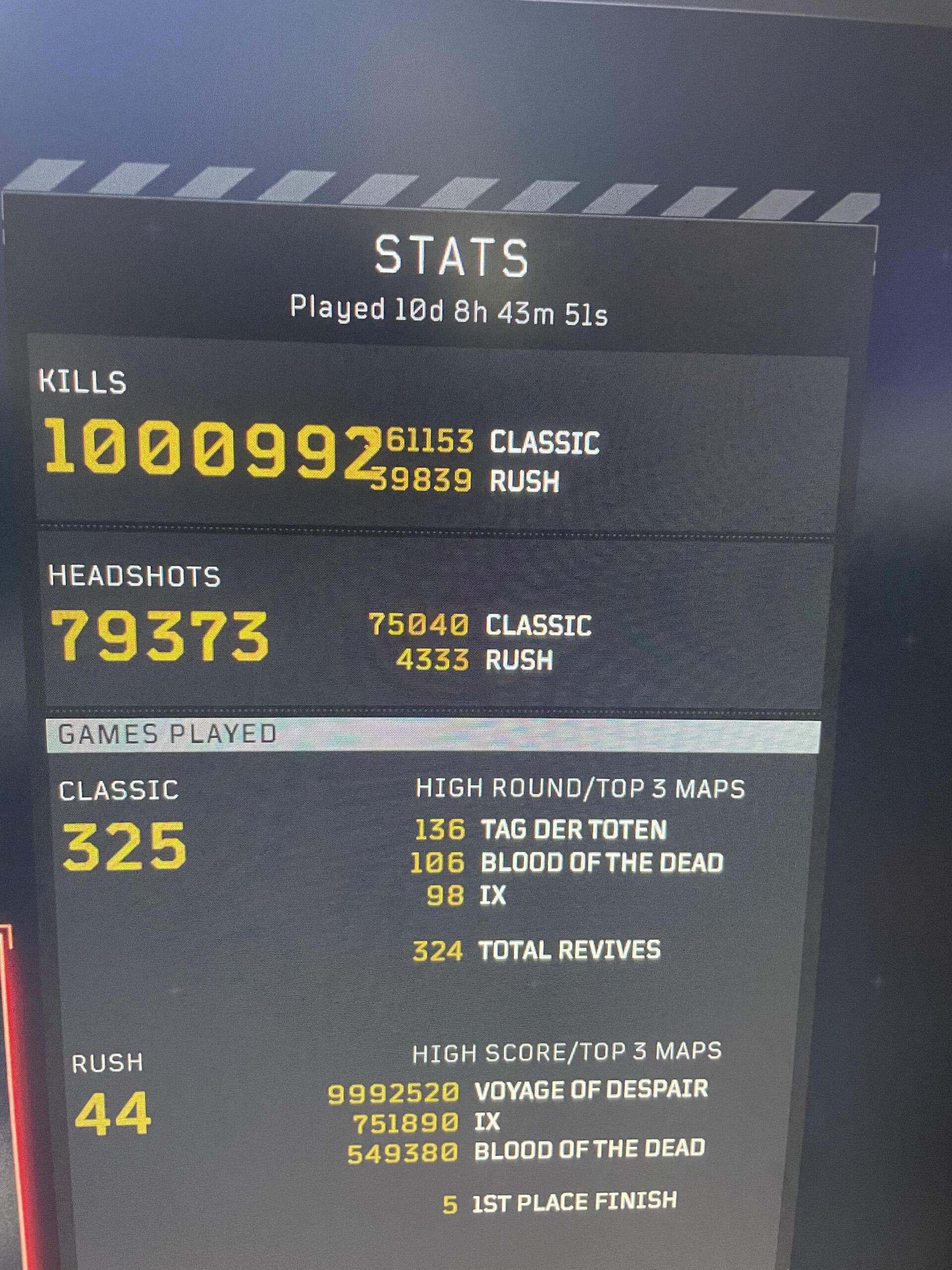 It says I have a million kills but the dark ops calling card is not unlocking. need help black ops 4call of dutyCall of Duty Black Ops 4codcod black ops 4 4 Comments Trippy_Josh 2 years ago Kill more. Rush doesn’t count. ATE47 2 years ago You have to look at the classic kills in the scoreboard, not in the stats SideShowBoob99 2 years ago What’s strategy are you using to get that many kills? I’ve probably played over 500+ games and am NOWHERE near 1 million CULO_CALIENTE420 2 years ago You need precisely 8,999,008 more to go it’s 10 million not one millionWrite A CommentYou must be logged in to post a comment.