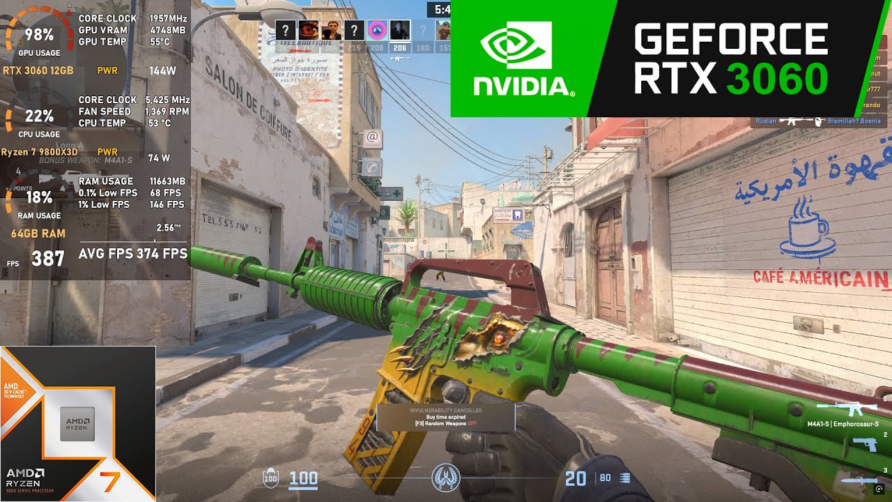Counter Strike 2 tested on RTX 3060 12GB + Ryzen 7 9800x3d at 1080p