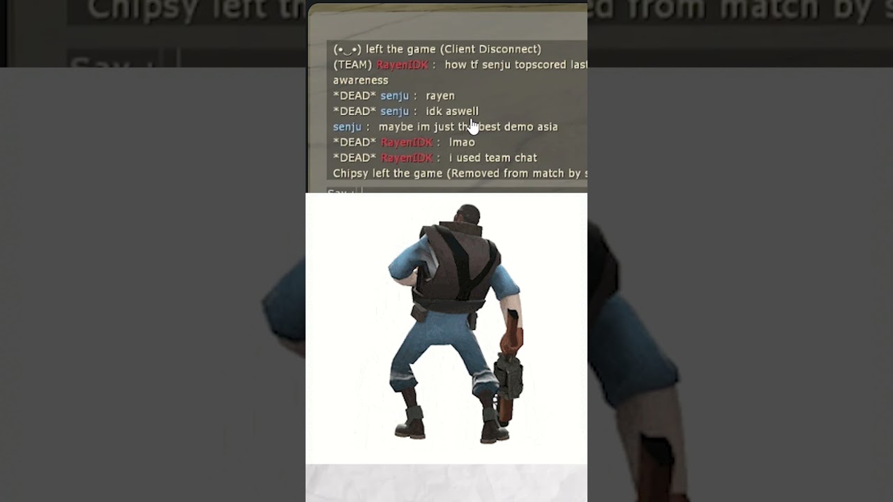 #shorts #shortvideo #short first person shooter video gamesfpsfps gamesfps games videosnathan vetterleinSeriamonseriamon gameplayseriamon gamingseriamon tf2seriamon youtubeTeam Fortress 2TF2voice actor 10 Comments @quintillionlmao 10 months ago lmao @TheEyelanderTF2 10 months ago if we are using logic, senju is actually sneaking on the red base to hear the (TEAM) chatSo basically, he's a Demo-Spy (Syrian Sp- @Thelozilla420 10 months ago Uff @Drone_gaming-b5b 10 months ago Bluh @Lucky_dot_Avi 10 months ago I don't get it 😛 @Super-X_TheFurry 10 months ago But someone else got kicked instead @DRACHE997 10 months ago Inverted weapons video got outed @Rdunsky 10 months ago Happened to me once aswell, having a full on convo when i was using team chat and they were on blu. And he didn't even get kicked smh smh @gabriel_thedumb1 10 months ago this fr @pyro-has-found-you.mp4 10 months ago he had 150% awareness,how else you think he heard you?Write A CommentYou must be logged in to post a comment.