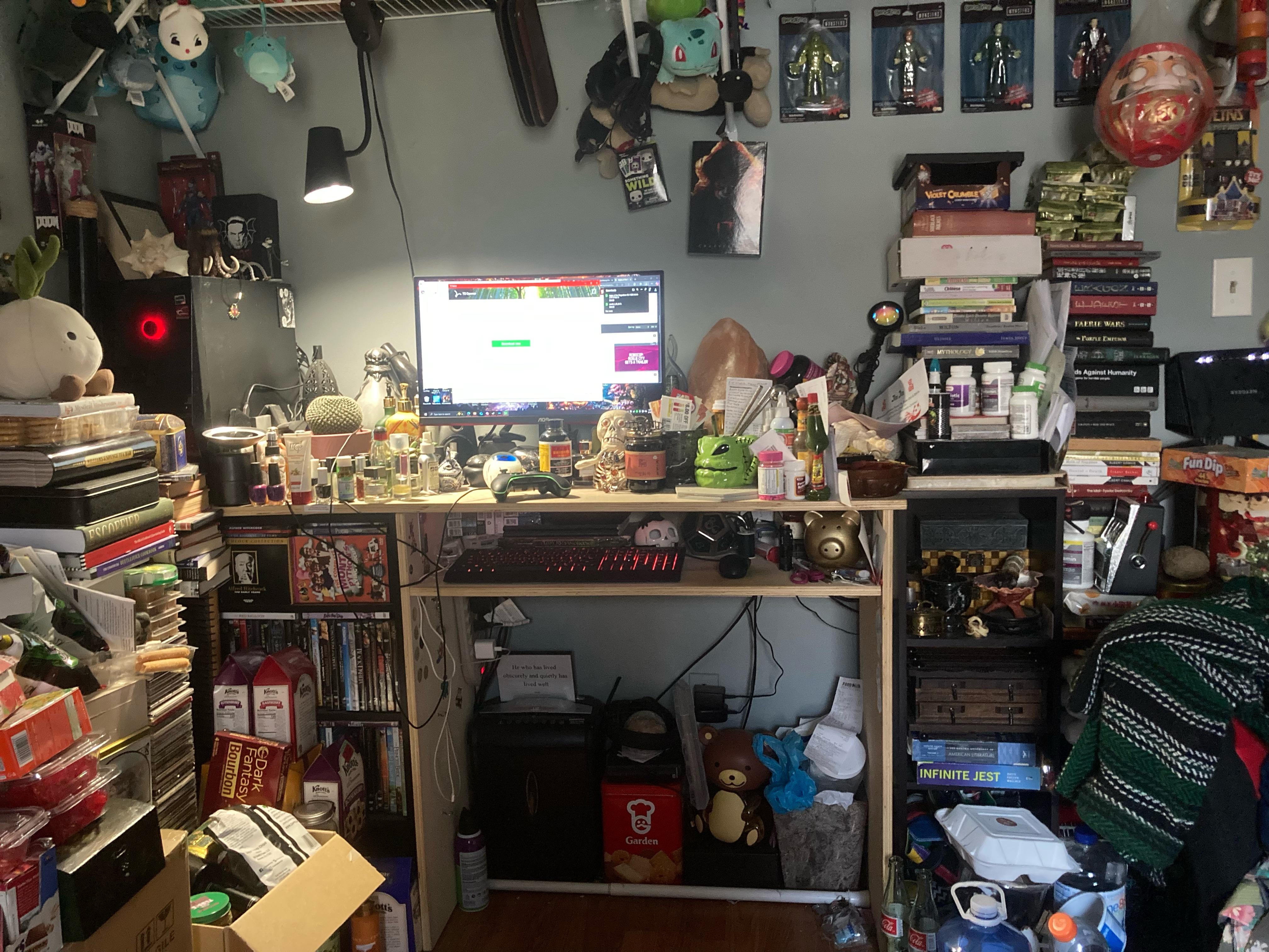 a little bit of organisation and clean up would probably help, but hey maximalism is a thing that people enjoy! if all the stuff there makes you happier then who cares. i would probably invest in some better storage and a bigger trash can though.