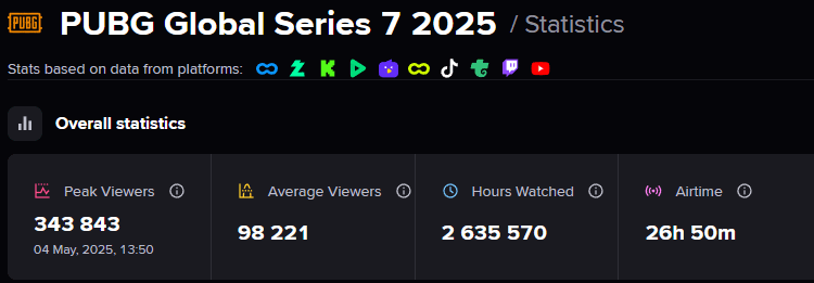 Source: PUBG Global Series 7 2025 – PUBG – Viewership, Overview, Prize Pool | Esports Charts Competitive PLAYERUNKNOWN'S BATTLEGROUNDSCompetitive PUBGPLAYERUNKNOWN'S BATTLEGROUNDSPLAYERUNKNOWN'S BATTLEGROUNDS CompetitionsPLAYERUNKNOWN'S BATTLEGROUNDS EsportspubgPUBG CompetitionsPUBG Esports 3 Comments Cool-Enthusiasm-8524 10 months ago PGS7 had solid sponsors which is nice to see! AllicusS 10 months ago The viewers stats from match 18 was like x2 compared to other matches VincentVanHades 10 months ago Holy shit. Good job. What about each regions?Write A CommentYou must be logged in to post a comment.
