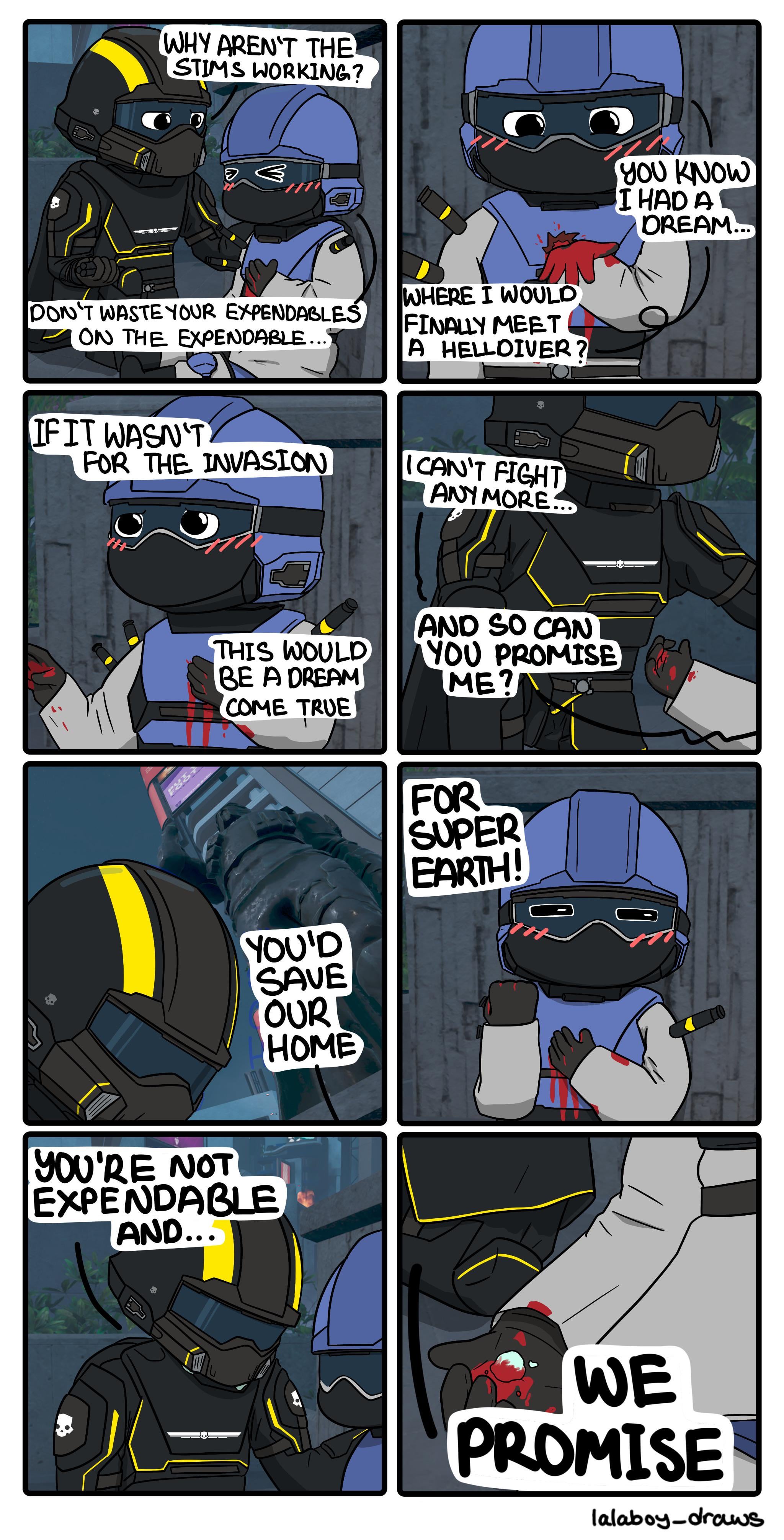 Watching them cheer me on while they get slaughtered is hilarious and fills me with democracy. For super Earth ;-;