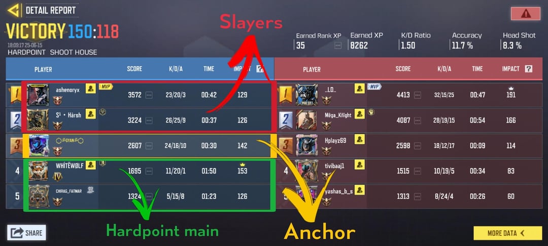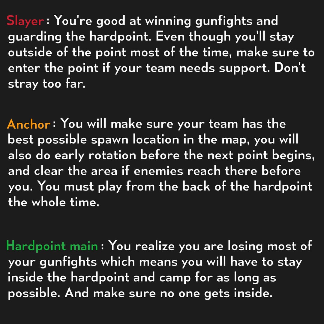 OBJ at the beginning of the hardpoint. Slayer at the middle of the hardpoint. Anchor when there’s only 15 seconds left on the clock.
