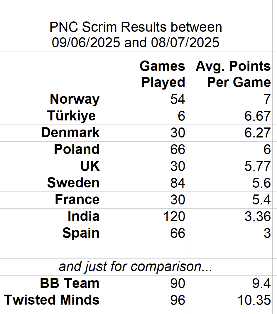 PNC team scrim results for the last month