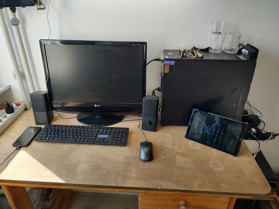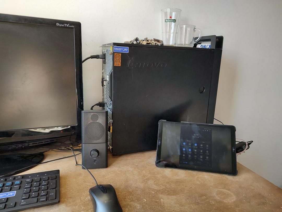 I put together the PC using parts from a few other random old PC’s I have, which all were free. The keyboard, mouse, monitor and speakers were also free. The only things in this picture that actually cost money were the somewhat unrelated 2019 Galaxy Tab A and the 2020 Galaxy A41.