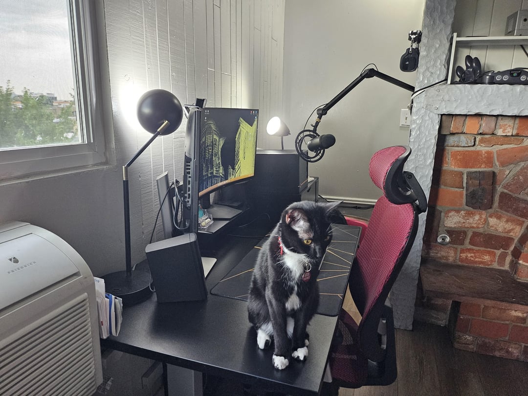 Cute kitties! How come the microphone is set up so far from the desk?