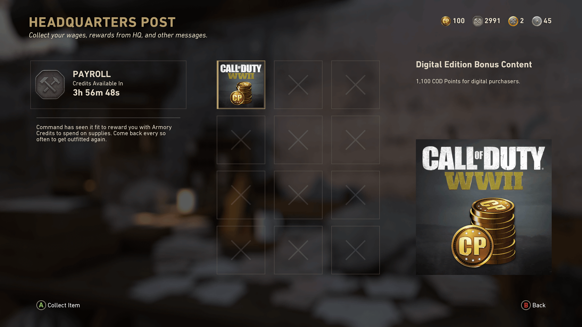 I got the deluxe edition so I can have all the dlc's and one of things I also get is 1100 cod points and it's in the mail and for whatever reason it wont claim it I can click on it and it'll say loading and then poof it's stops and I don't get it. I've tried force quiting then reloading and spamming a and still nothing. any idea on how I can claim the points?