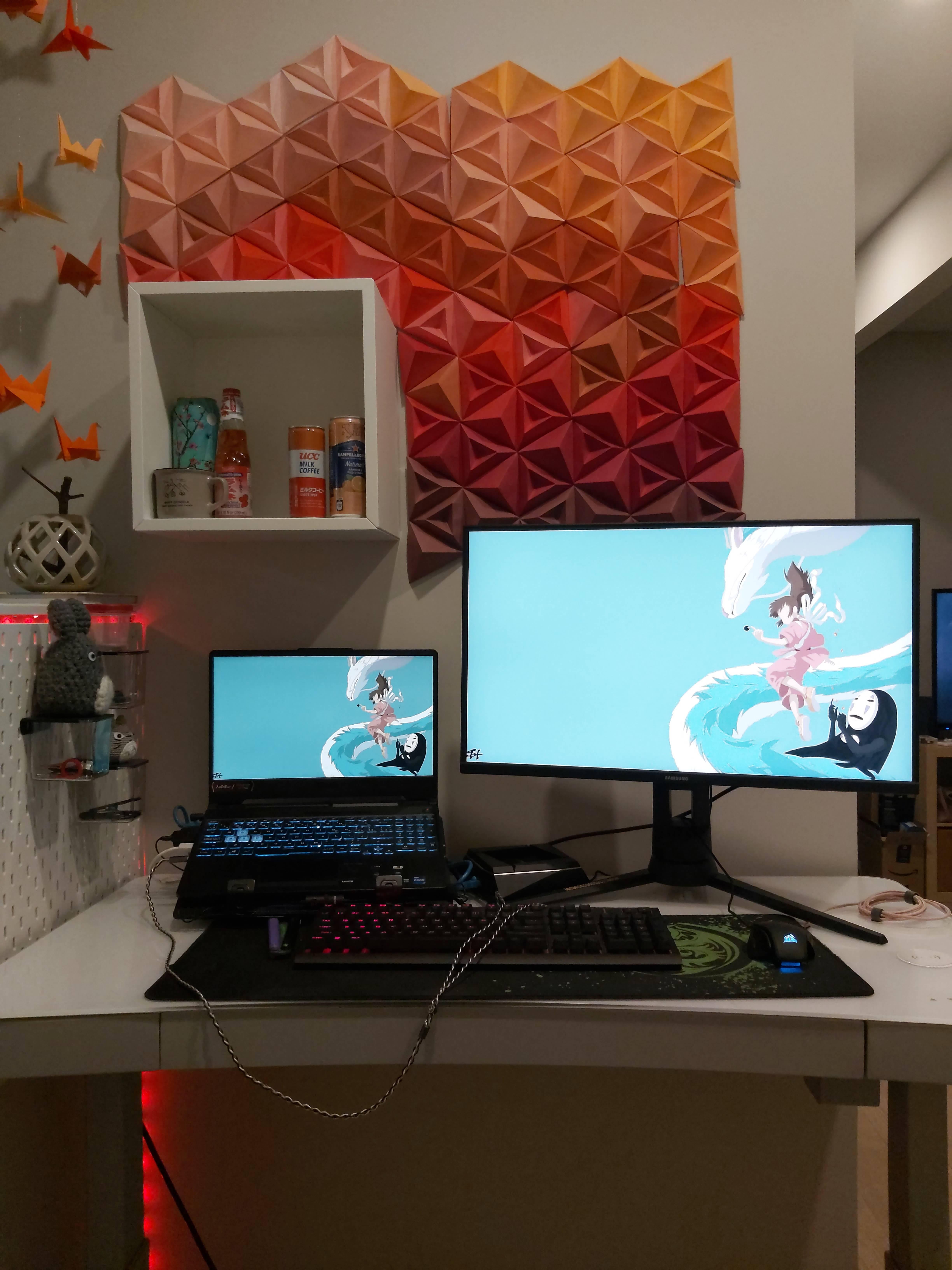 Standing desk, laptop, and origami that I did