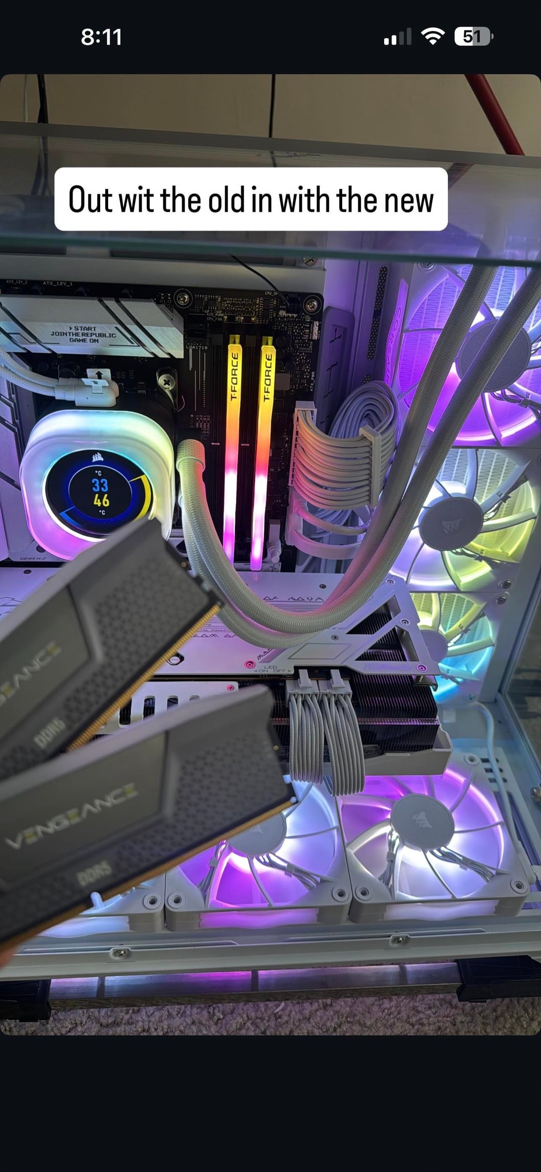 Share Facebook Twitter Pinterest LinkedIn Built 6 months ago. What you guys think? 7900XT 7800X3D 32GB CL30, 6000Mhz T-Force RAM-recently switched from corsair vengeance CL-36 6000MHz 7x Corsair ICUE fans~ 6intake 1exhaust B650A MB game pcgaming pcPC