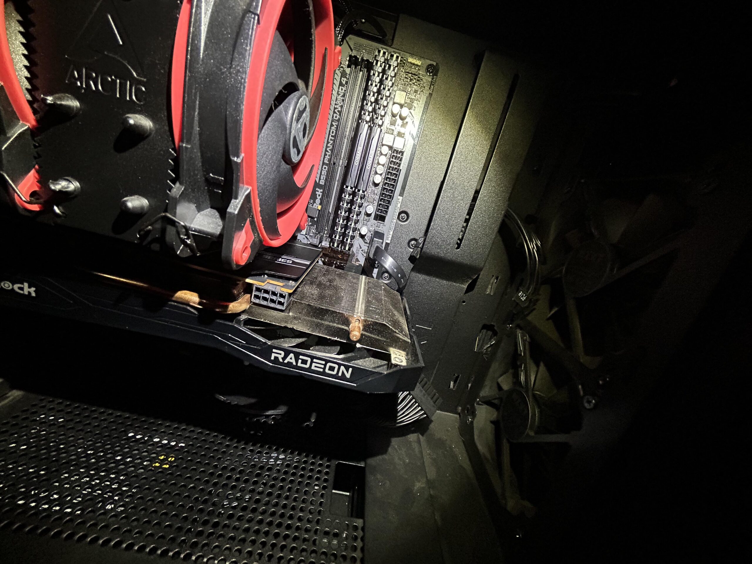 With the new PSU in and all of the parts still installed I went ahead and pressed the button. Fans spinning light flickered for thunder 2 seconds then it went off.