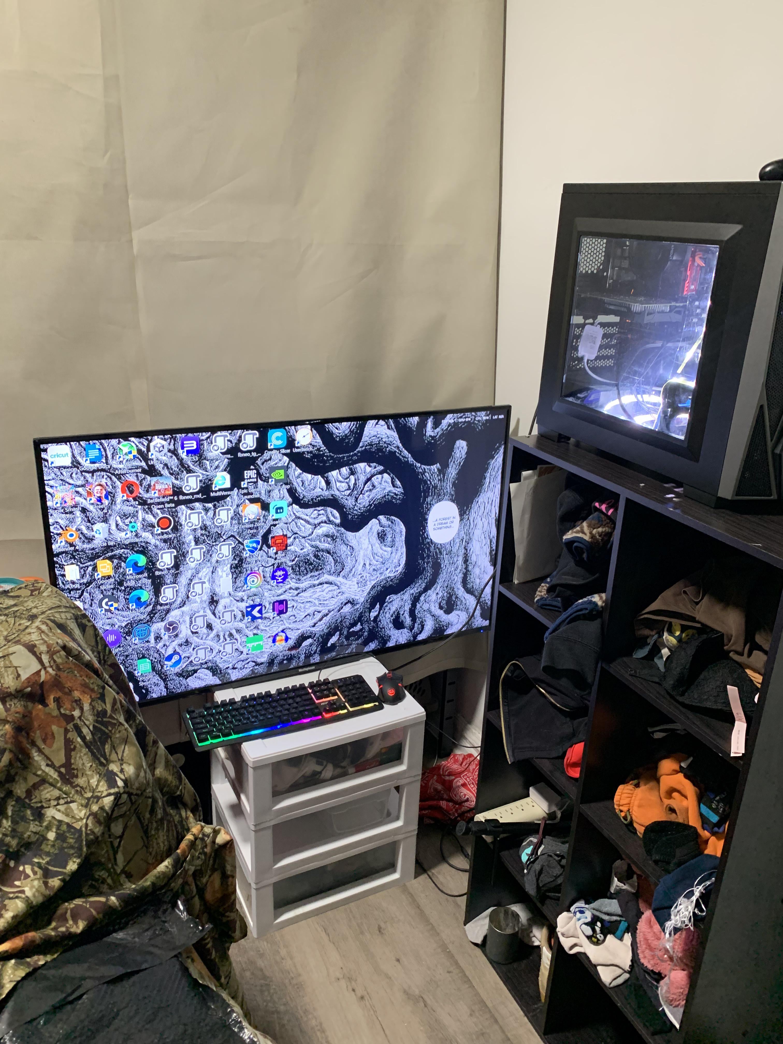 Had to move in a hurry due to the apartments 2nd late night carbon monoxide leak. Haven’t even finished unpacking but we’re good to go Shitty Battle StationsShitty Battlestations
