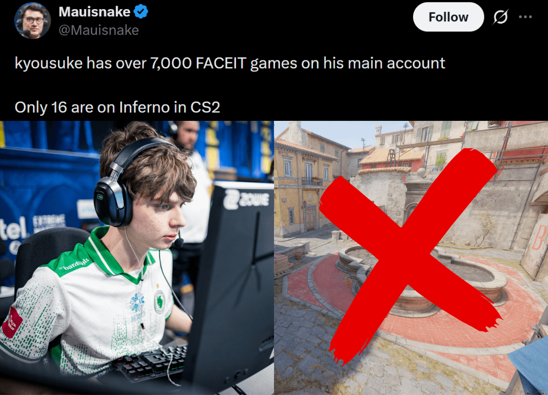 Only 0.23% of kyousuke’s total Faceit matches have been played on Inferno