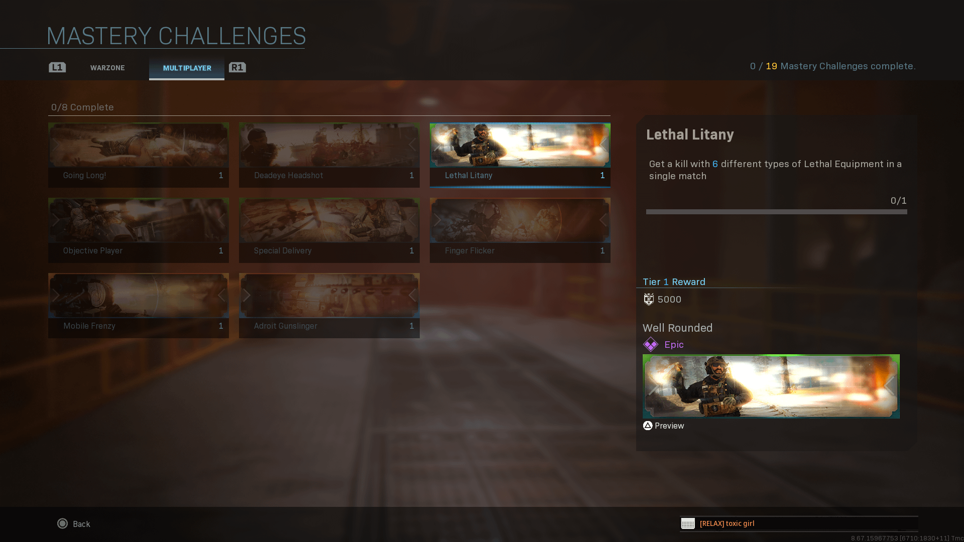 I’m looking for players to complete the mastery challenge that requires 6 kills using different lethal equipments.
