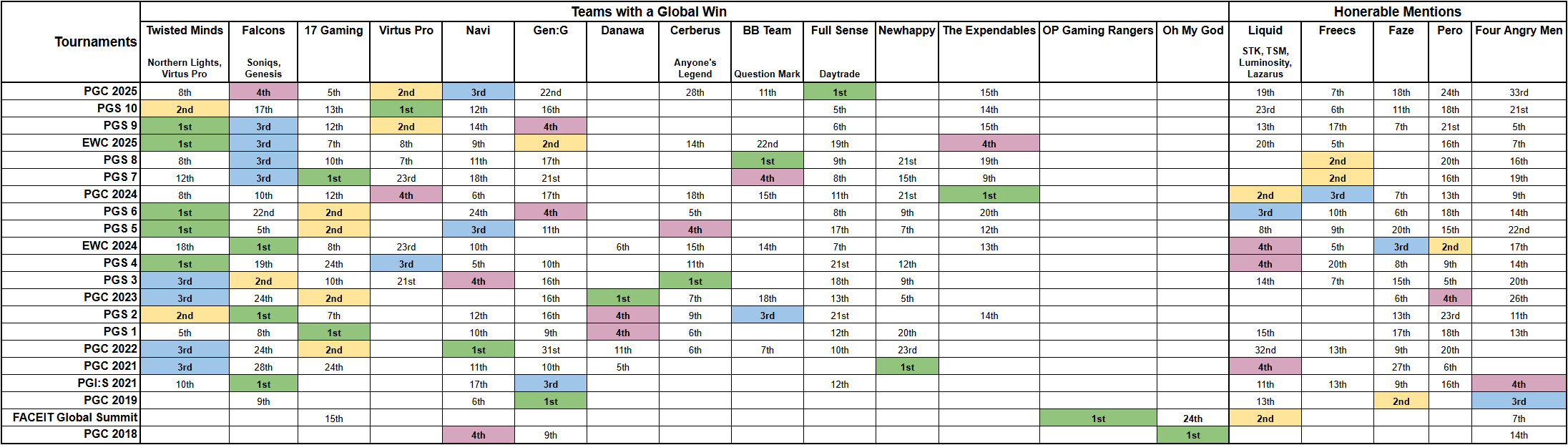 I am going to start off by saying this is by no means "the order" for the top teams, but I just wanted to put everything onto a single board for visualization purposes. Morwon had done a cool board based on points earned the other week, but this chart is strictly by Global Finals finishes. I tried to keep Teams and/or Orgs together and I listed the various names that they went under.