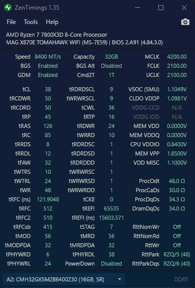 I really didn't expect this to work. I was playing around with RX/TX DFE Taps and some Impendences, trying to stabilize CL34 8200, so decided to go for 8400 out of curiosity, with 105BCLK, loosened every timing possible, switched my ProcODT to 40 Ohms from 26.7 Ohms and set both RX/TX DFE Taps to 2 Taps to stabilize training. This is definitely not stable in the slightest, especially on the 7800X3D, since BCLK hurts this CPUs stability, due to the limited amount of VCore and VDDIO voltages, but at least I know this board can handle 8400 with the right settings and voltages. I'm upgrading to the 9800X3D or the upcoming 9850X3D in a few months, so I'm going to see if 8400 will be possible from there.