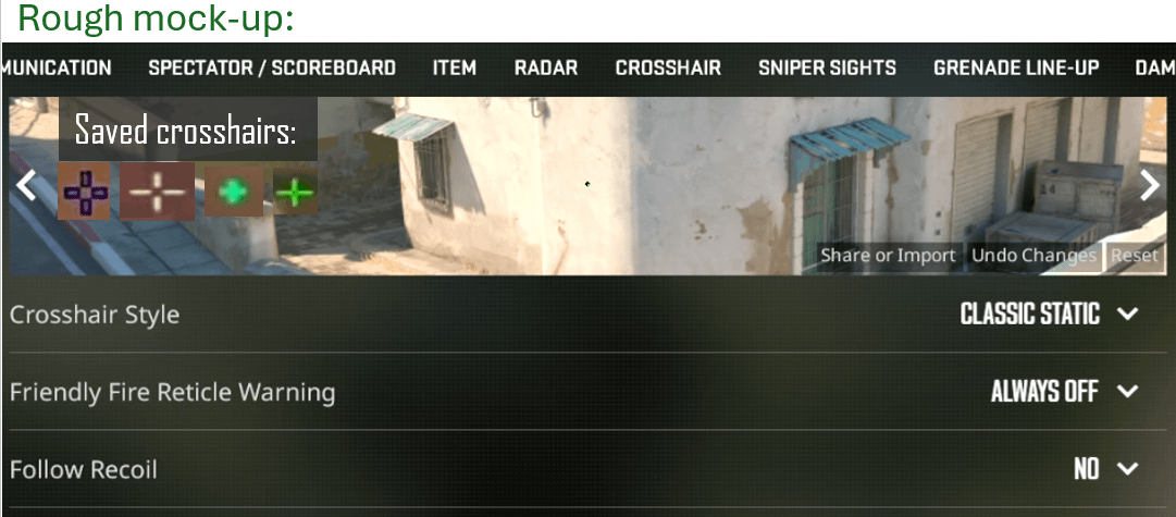 QoL suggestion: It would be nice if we could save and instantly swap custom crosshairs. Counter strikecounter strike global offensivecs:goGlobal offensive