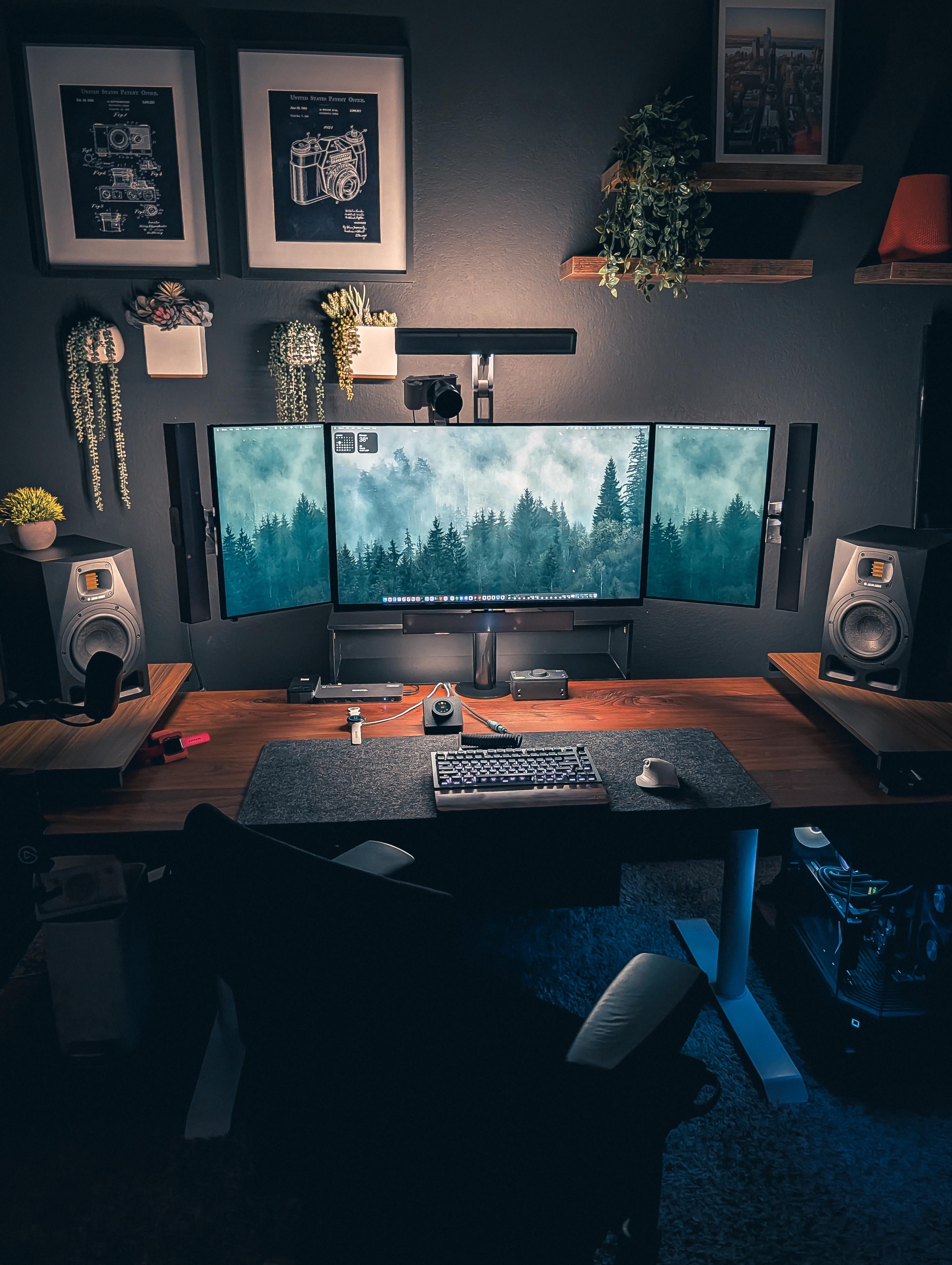 used to have 2×27". Too heavy, too much space. now on 2×18" portable + 32" in middle. Battle StationsBattlestations
