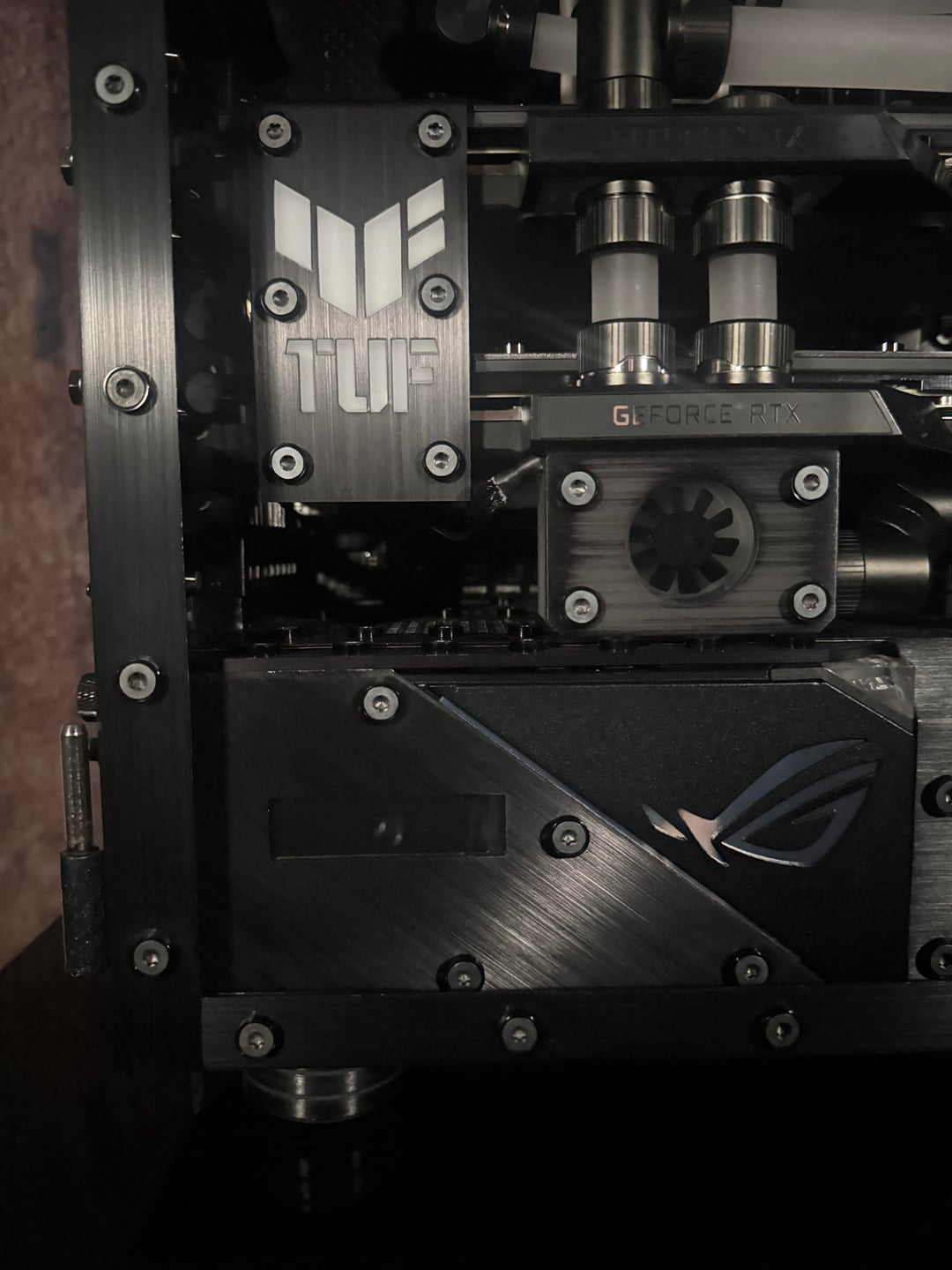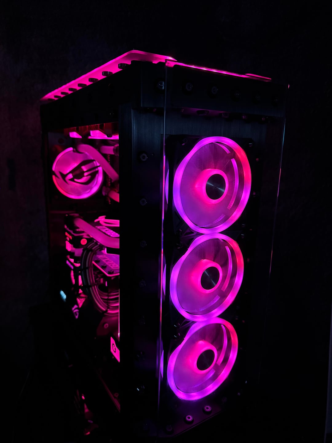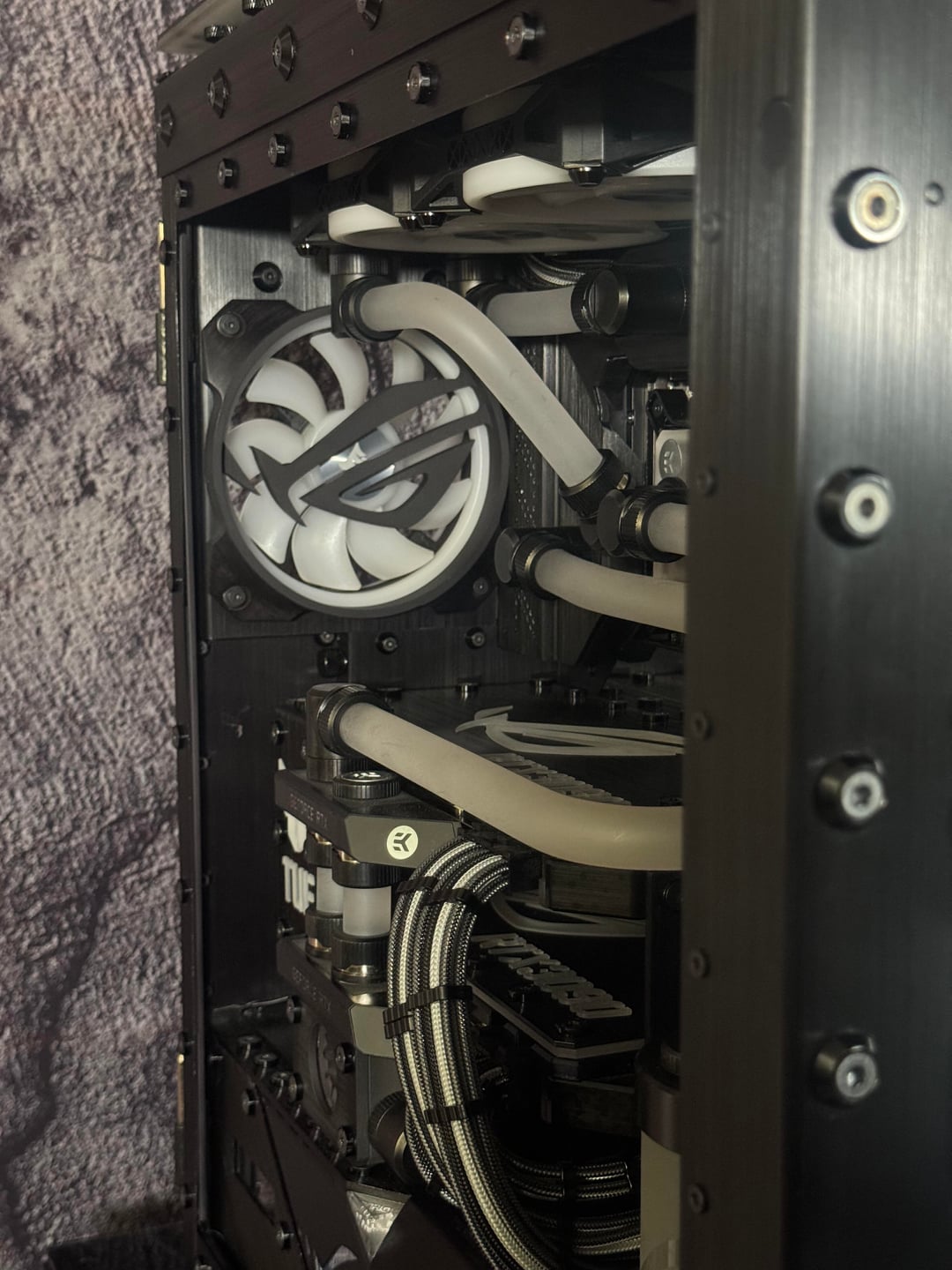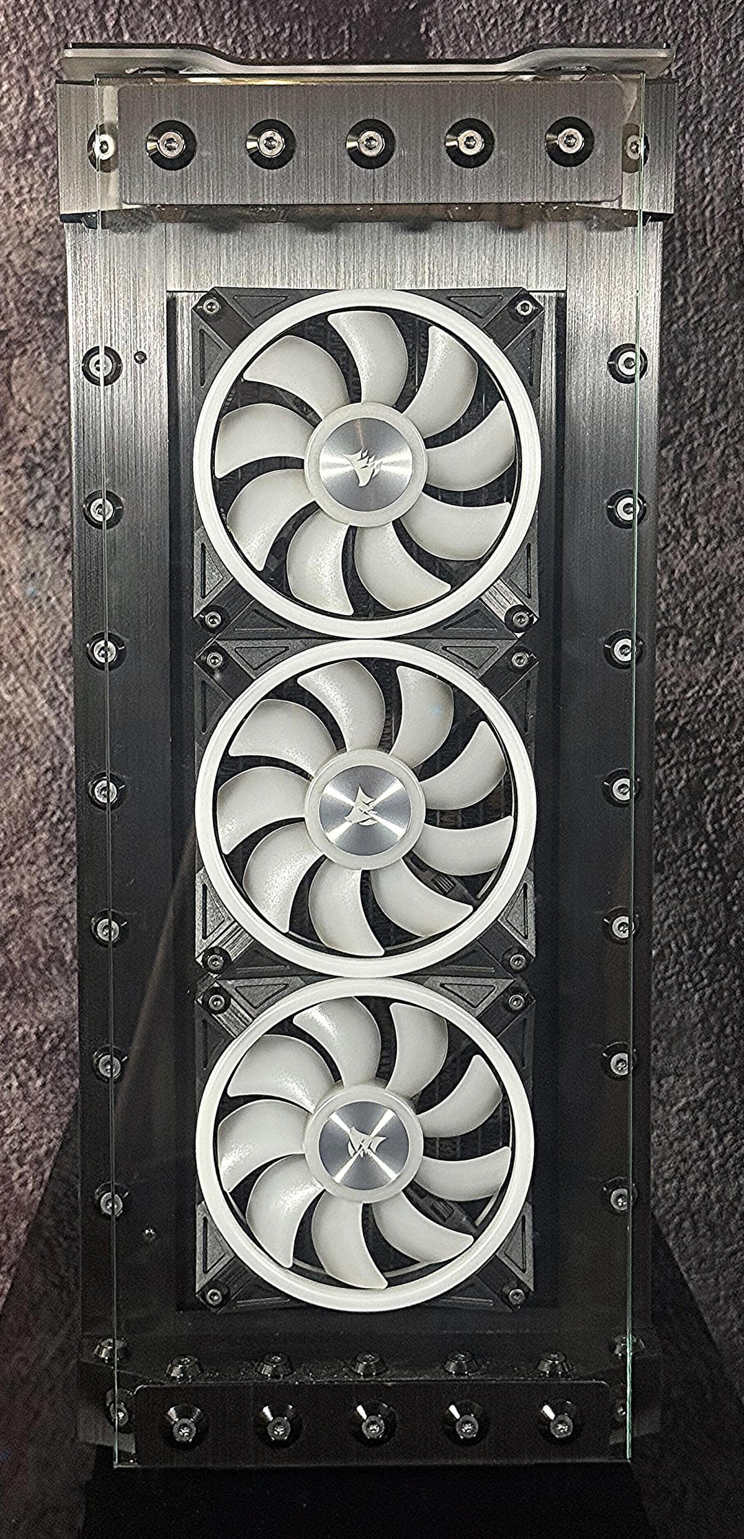 There were many problems to overcome, to make this rig a reality. First the top rad had to be relocated, to the far back of the tray, and further forward toward the opening, to allow clearance for the distro plate. A port was cut in the power supply cover, to facilitate moving the power supply to the front. This, along with some brushed anodized aluminum, give the power supply more of an integrated look. The back fan port was modified to allow the fan to be mounted from the back, and have just the RGB bezel poking through, to mate with the ASUS fan grill. These were the major issues, but there were many.