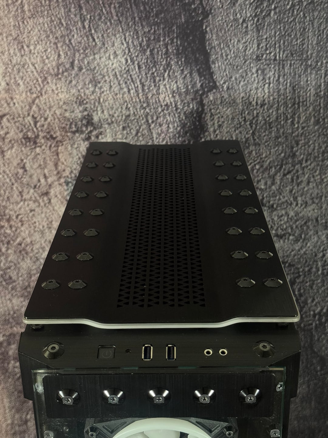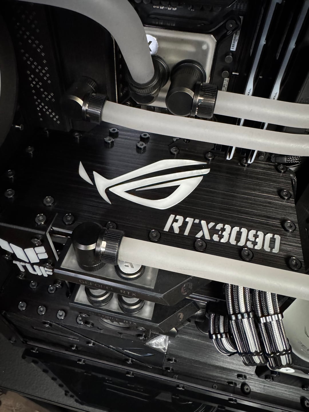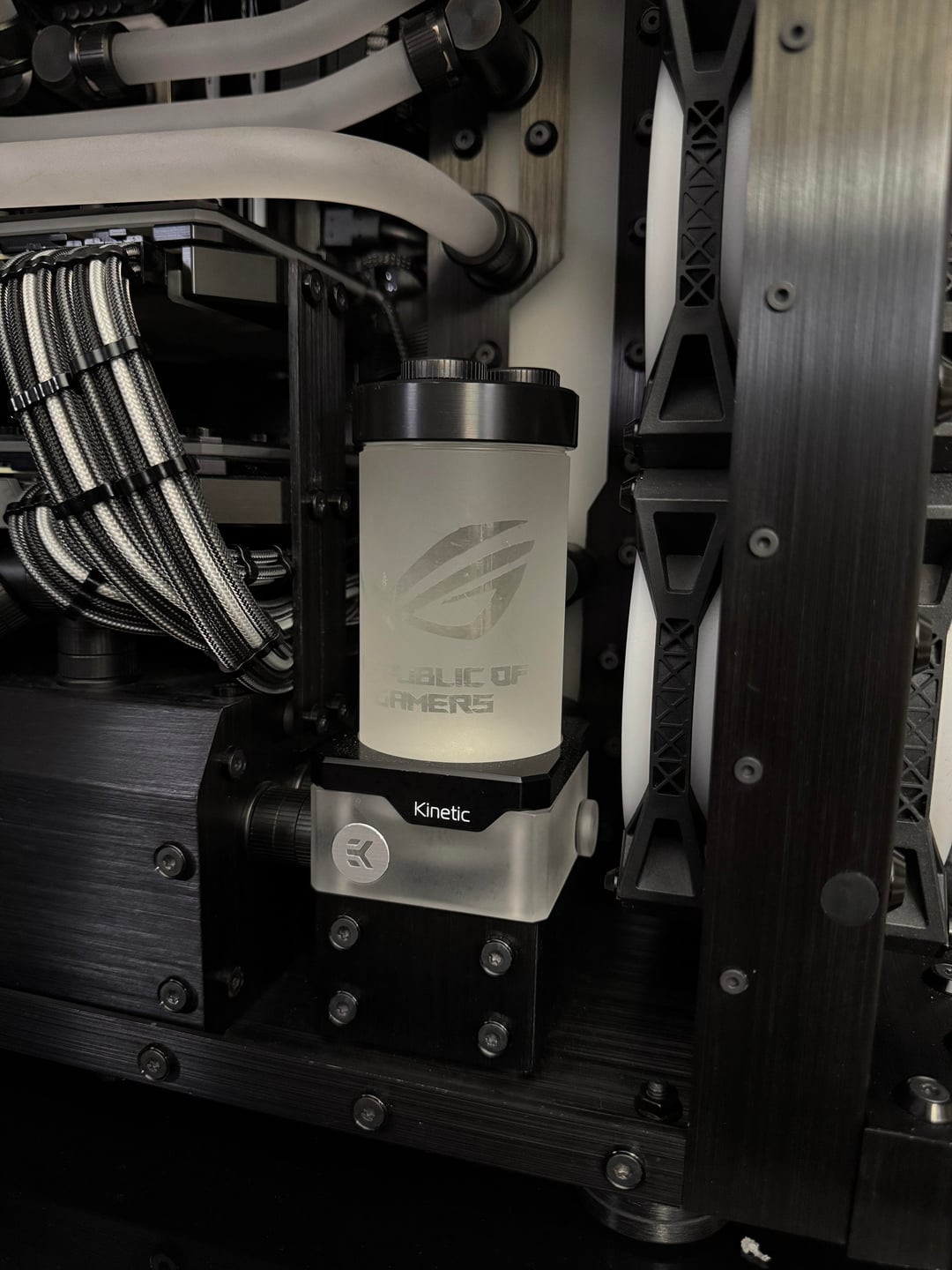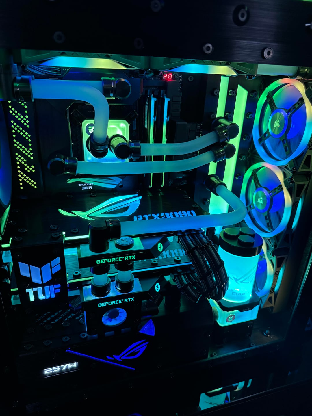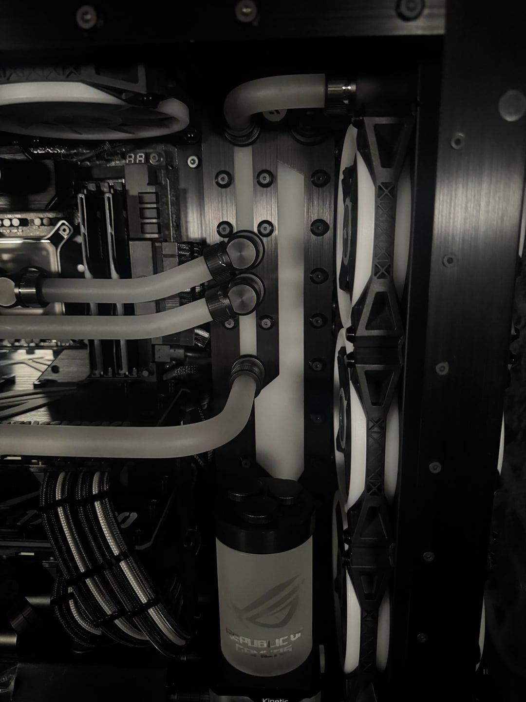 There were many problems to overcome, to make this rig a reality. First the top rad had to be relocated, to the far back of the tray, and further forward toward the opening, to allow clearance for the distro plate. A port was cut in the power supply cover, to facilitate moving the power supply to the front. This, along with some brushed anodized aluminum, give the power supply more of an integrated look. The back fan port was modified to allow the fan to be mounted from the back, and have just the RGB bezel poking through, to mate with the ASUS fan grill. These were the major issues, but there were many.