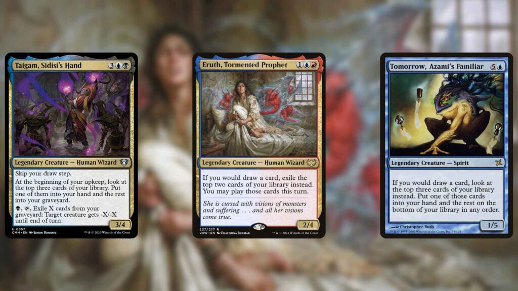 While getting ahead of Zur’s Weirding’s penalties is one way to use the card, some Commanders create card advantage without drawing cards at all, getting around the enchantment more directly. Taigam, Sidisi’s Hand, Eruth, Tormented Prophet, and Tomorrow, Azami’s Familiar, for example, turn your normal draws into Anticipate or Impulse Draw effects. Similarly, Stock Up, Underrealm Lich, and Enduring Renewal can do the same from the 99.