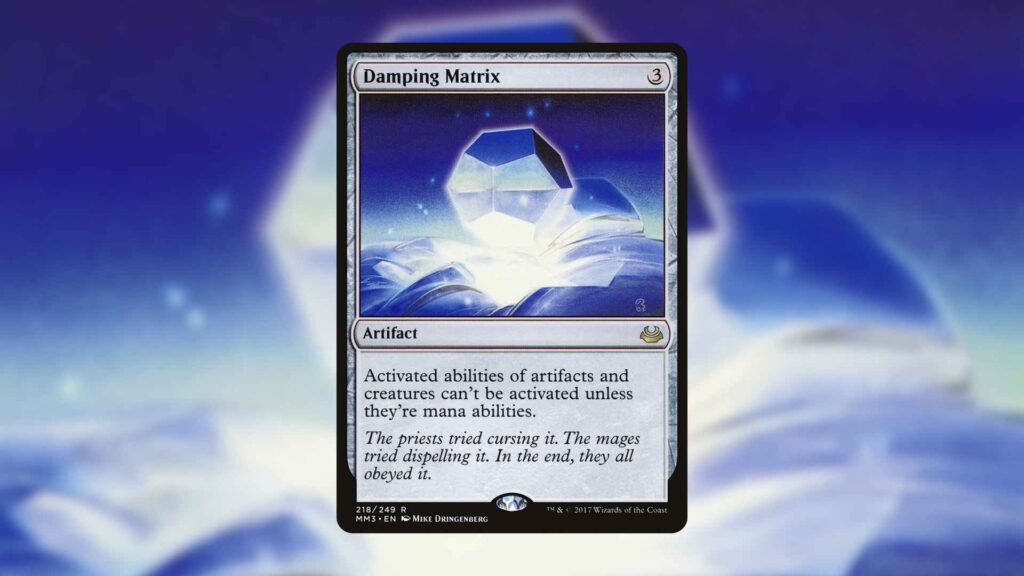 Damping Matrix is also capable of turning off activated abilities of creatures, affecting popular Commanders like Krenko, Mob Boss, Yuriko, the Tiger’s Shadow and Kenrith, Returned King. Of course, this will also affect your own cards, which means this $0.50 artifact won’t fit in every Commander deck.