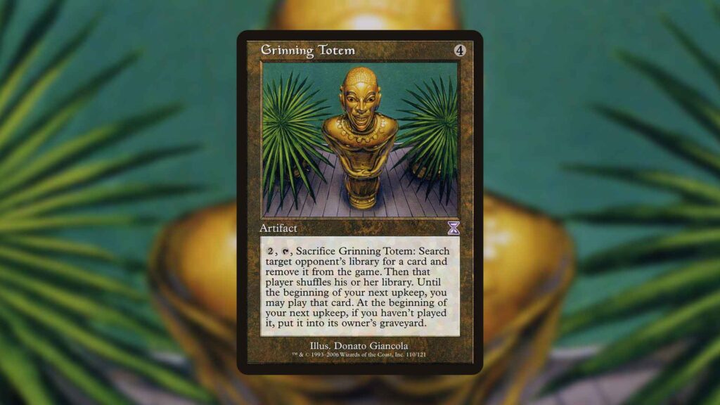The mana investment required by Grinning Totem is expensive, but this artifact is capable of shutting down any MTG Commander deck, so long as you know the right card to pick. Searching your opponent’s library to grab a card from it can be absolutely devastating, but there are some downsides to this bizarre Totem.