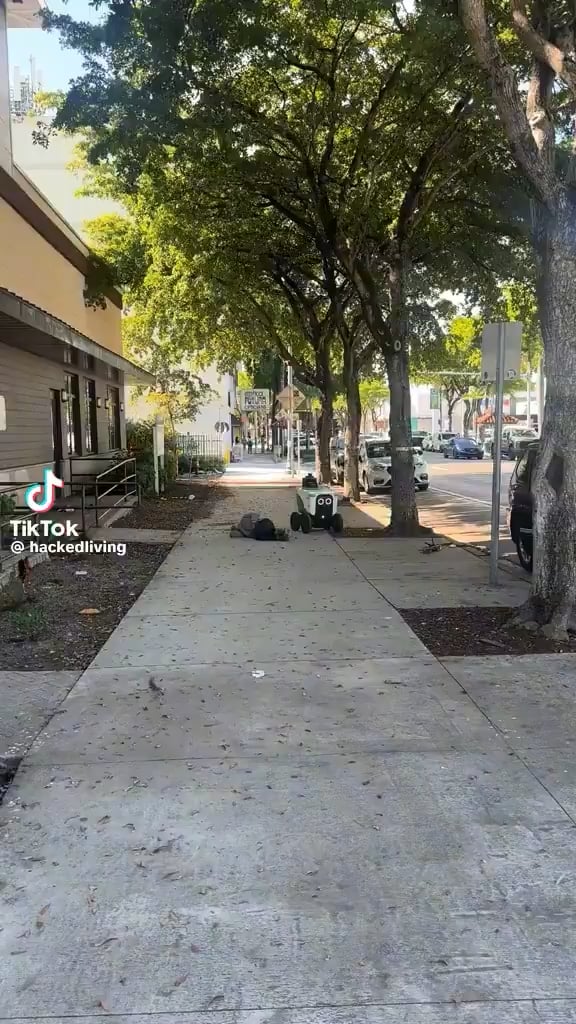 Delivery robot named “Akira” navigates around homeless man sleeping on the sidewalk. CyberpunkCyberpunk MemesHigh TechLow Life.
