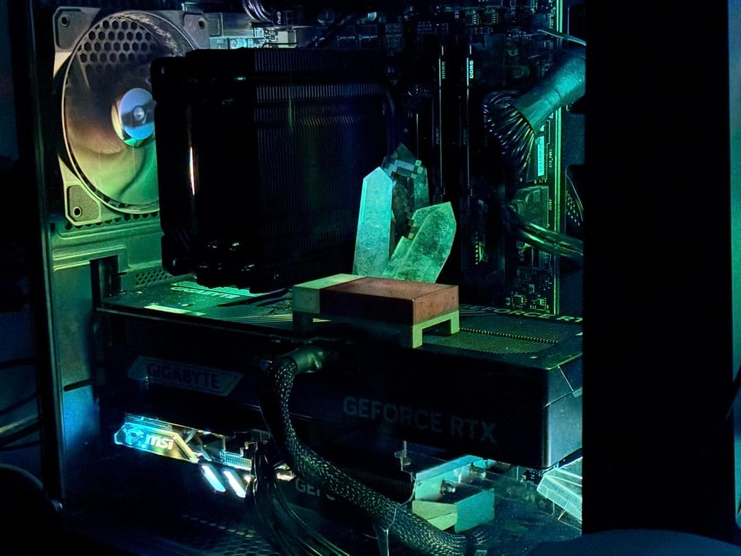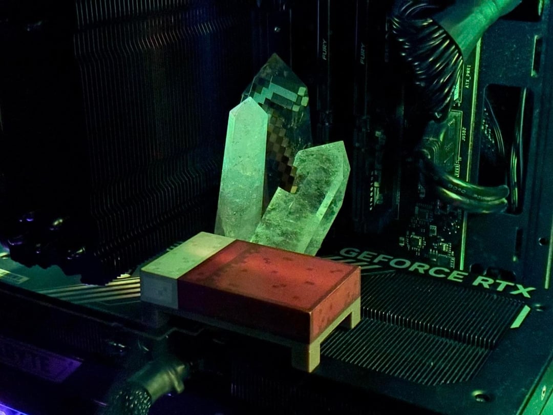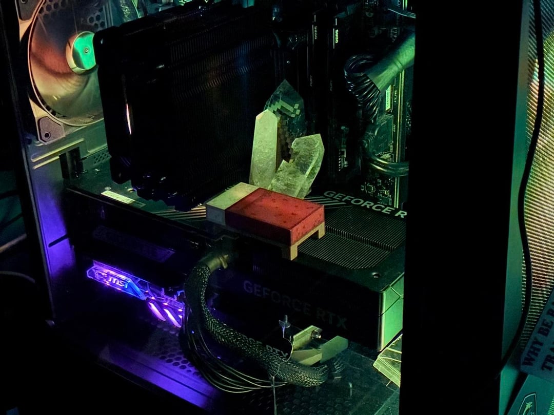 Did some Googling and found that mounting my CPU cooler fan on the back of my heatsink instead of the front should have a minimal impact on temps. The crystals block less than a sixth of the cooler, and most of that blocked area is in the corner, which the circular fan isn't going to pull as much air through. Still, I welcome any feedback from those who know more than me or have experience with a pull configuration.