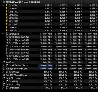I’ve been messing with tuning my 9800x3D, messed with PBO first but seemed to have more success forcing an all core OC. 5.4 @ 1.275v. Test is still running while I’m at work, but 7hrs overnight and it’s been stable in AIDA64. Also tested RDR2 benchmark at 720p / 1080p / 4k as well as CyberPunk same resolutions. I tried 5.5 and 5.45 it would boot into windows but crash in ADIA64 or anything CPU heavy. Even gave it 1.35v for a single boot and didn’t help stability