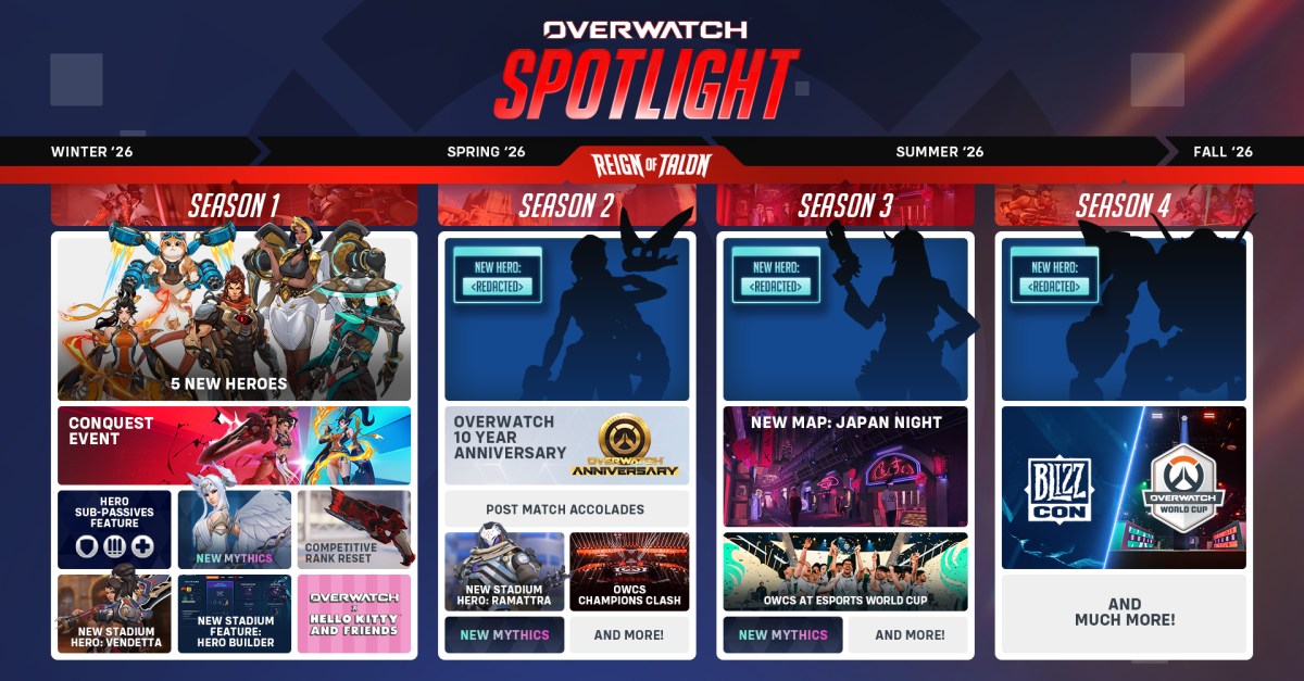 Just a few years after Overwatch 2’s free-to-play 5v5 replaced the original, Blizzard announced it’s dropping the “2.” There’s been a steady flow of other changes lately (like the return of 6v6), but the plan for this next year includes 10 new heroes (Domina, Emre, Mizuki, Anran, and Jetpack Cat arrive when S1 launches February 10th), new maps, menu updates, a Conquest meta event, Reign of Talon narrative arc, and more.