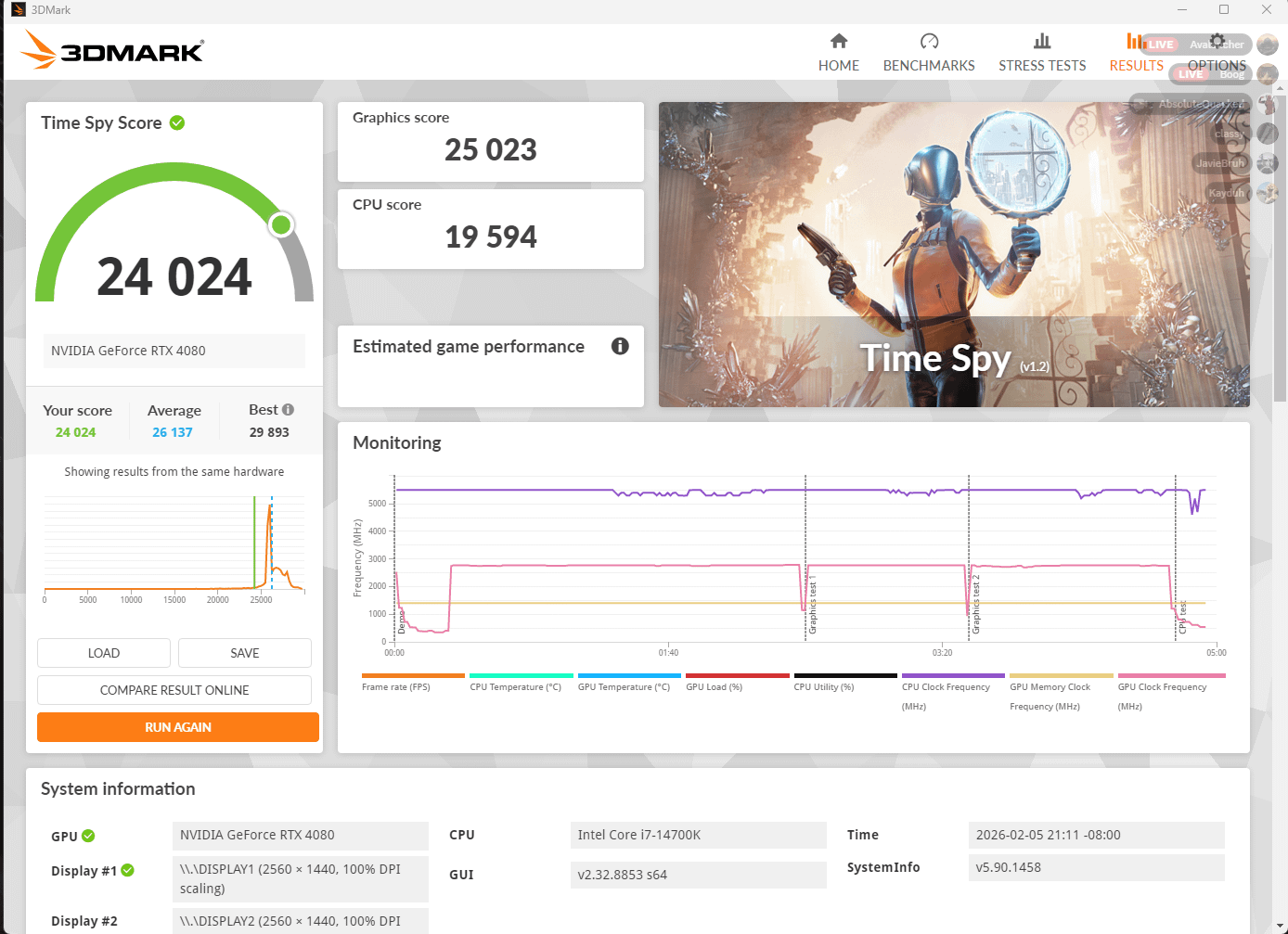 Hey all, I've had my Gigabyte 4080 OC card for a year or two now, and when I first got it, my timespy score was around 27k, now its sitting at around 25k. Is this a normal score for my card, or could there be something off? Any advice is appreciated!