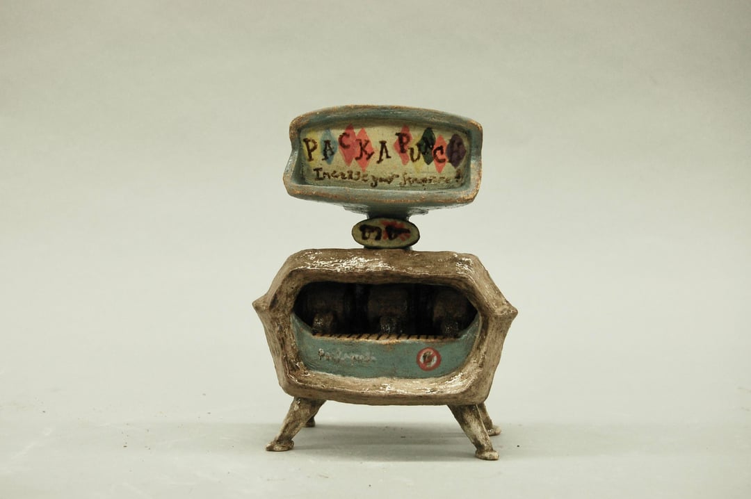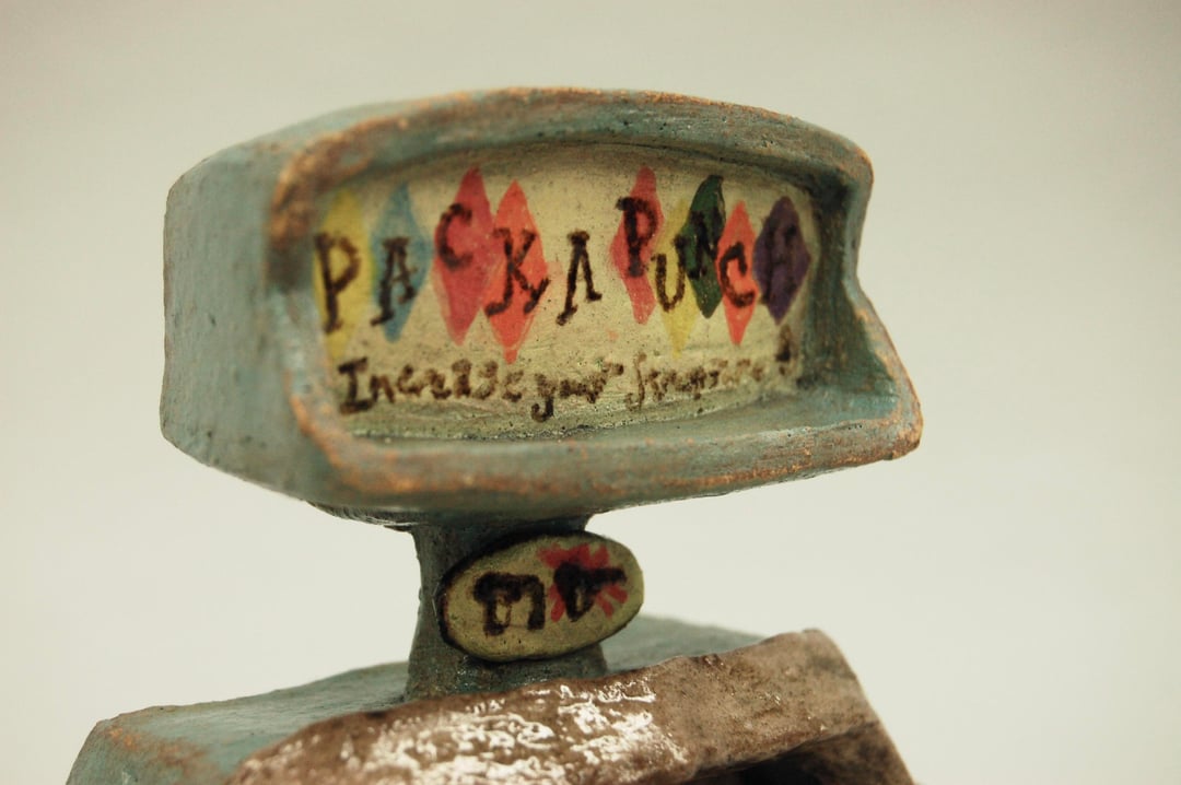 Posted the perk machines a few days ago and almost forgot this one. It’s made out of Earthenware ceramic clay, finished with underglazes and engobes. It’s a few inches tall.