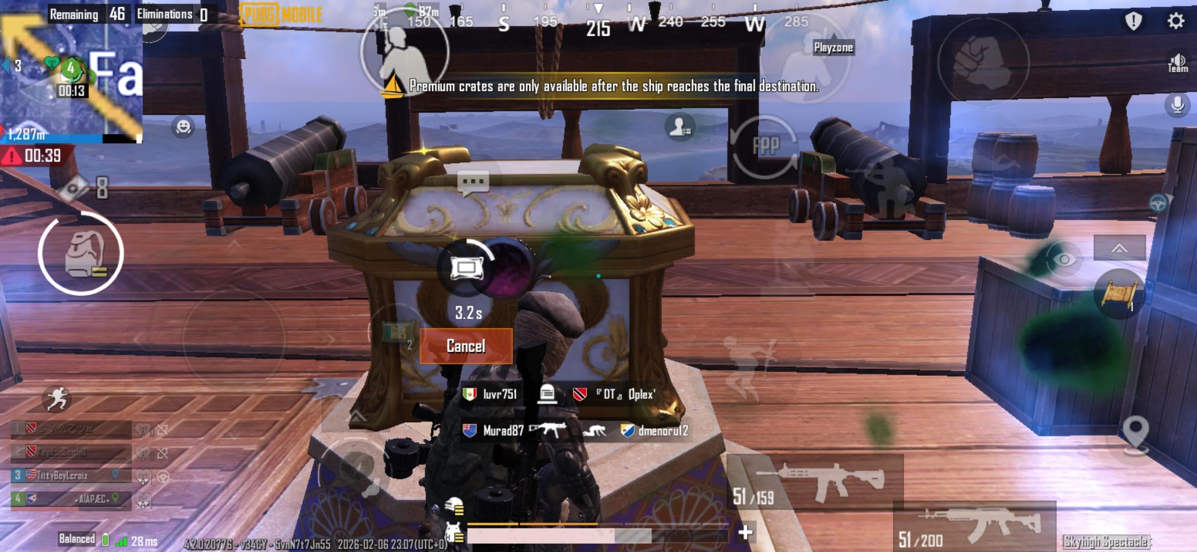 Hi u/errora403 I played a bunch of games today and unfortunately I can't remember which one it was but, on one of them I rode the boat to the end of the flight path and the premium crate would not open before the boat dissappeared.