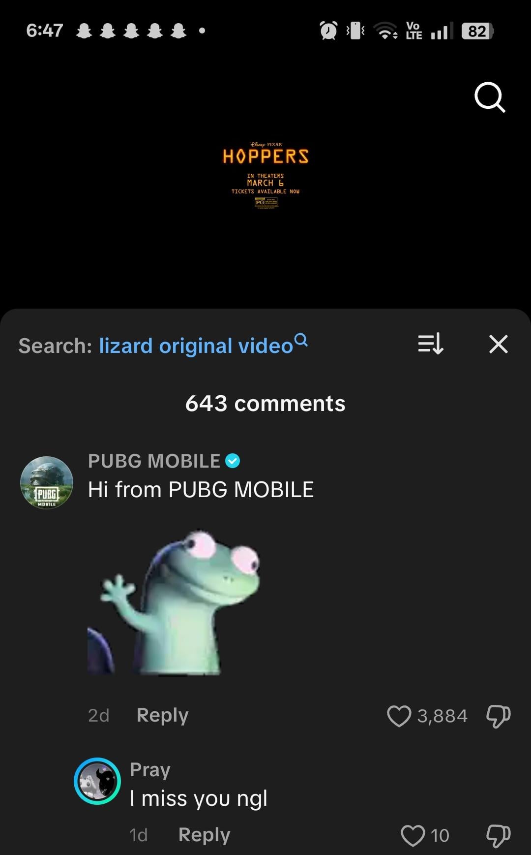 I was just randomly scrolling in the fyp and I just found out that the official PUBG Mobile account made a Lizard gif reply in the official Pixar account.