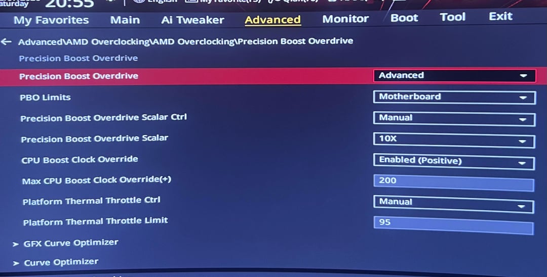 I have an effective custom loop setup for my 9800x3d. Temps have been staying pretty nominal for what these settings are. I wanted to increase the “MAX CPU Boost Clock Override(+)” setting to 225 but it states that it’s an invalid input range. I also pulled up 2 other OC setting screens if they should be modified. Where can I go from here? How can I pull more performance out the chip without going too advanced into it?