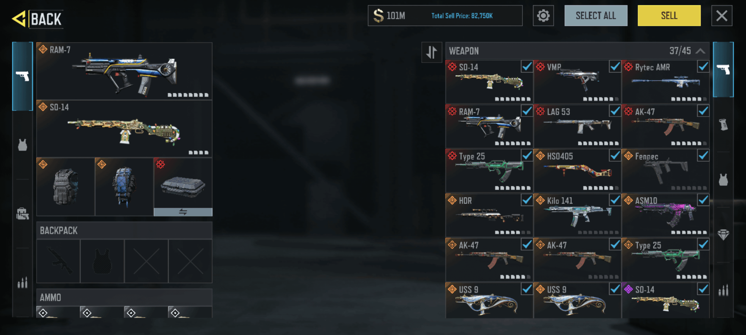 My total comes to around 101M including weapons, loot armor and backpack.
