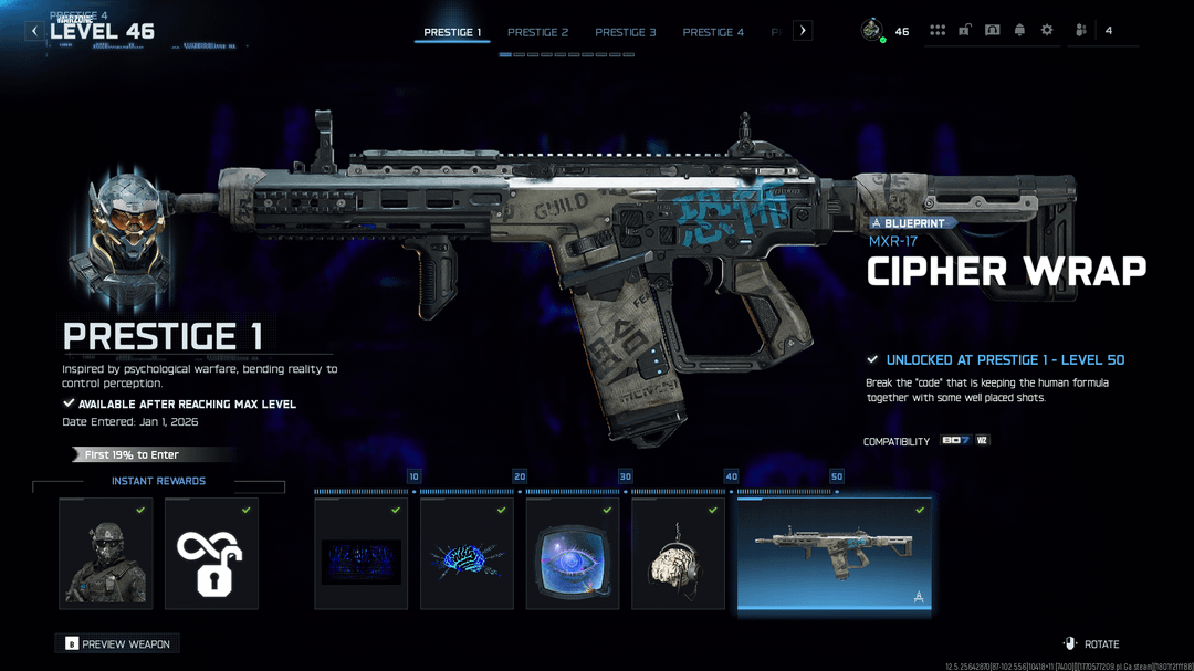 For example, at Prestige 1 final level, the reward is the MXR-17 blueprint called “Cipher Wrap.” It shows as unlocked, but when I check the MXR-17 blueprints, I only see “Firing Line” and not Cipher Wrap.