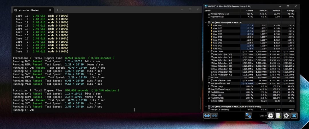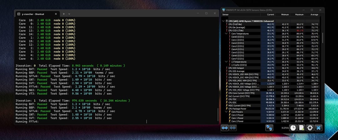 – Y-Cruncher Benchmark – full suite, 26mins (stopped mid second run), 90C only during SNT. SVT was next hottest at 84C