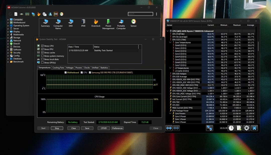 I’m running a 9800x3D / MSI Gaming Plus WiFi / be quiet! Light Loop 360mm AIO with Artic P12 Pro push & pull fans. Push fans at 50% and pull at 55%. My suite of stress tests/benchmarks is below with times I ran them and peak temps. Assumming Reddit posts pics in the correct order list should match the pics: