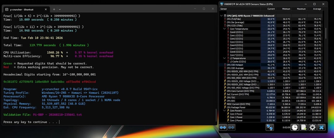 – Y-Cruncher – CPU only pie calculation – option 4, about 2mins, 82C