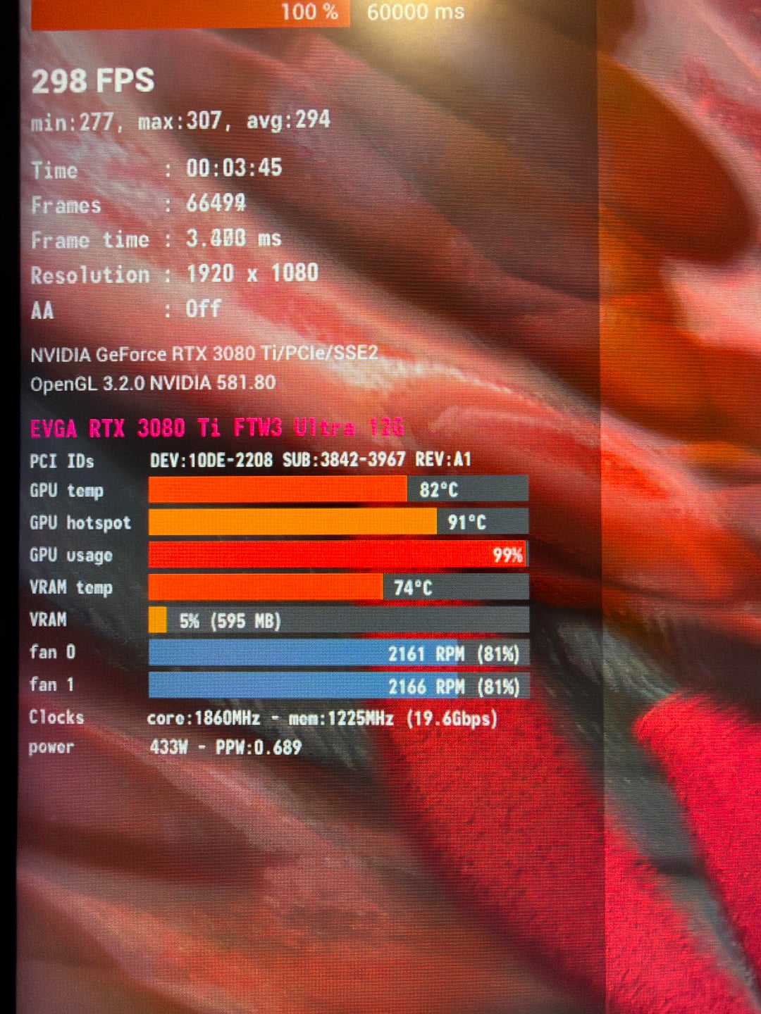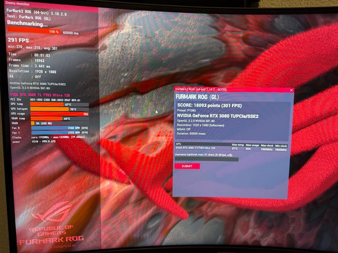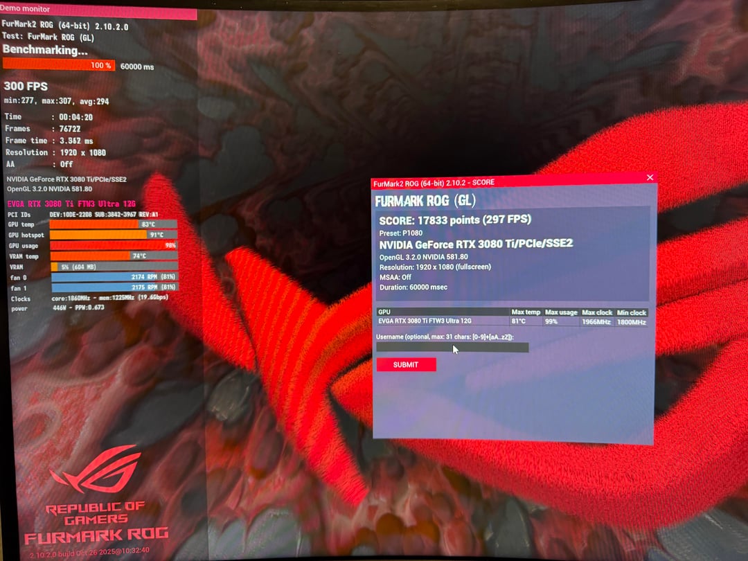 Was doing some testing on a EVGA 3080Ti FTW3 on a thermal solution. First picture will be before, settings with the power limit on Max, fans at 81%, +300mem, +100 on the core clock.