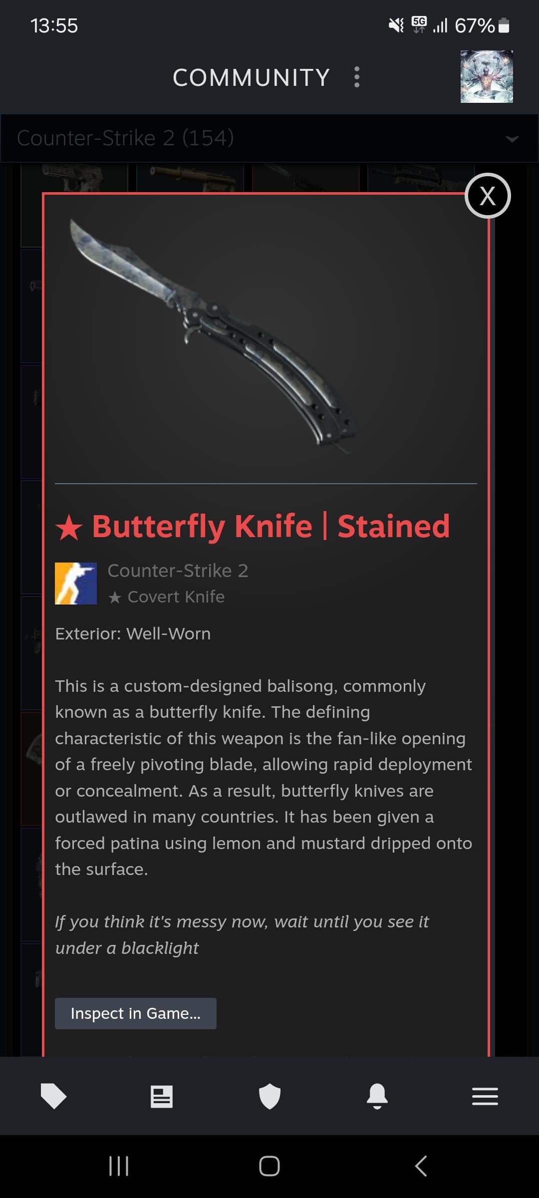 Looking to trade this butterfly for a karambit, preferably a 1:1 with similar value or slight downgrade (no overpay but u pay difference in other items) counter strike 2cs2