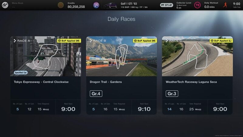 In order to access the Daily Races, you’ll need to unlock Sport Mode, by completing Menu Book 9 (“Championship: Tokyo Highway Parade”) in the GT Cafe single player hub. A PlayStation Plus subscription is required to take part.