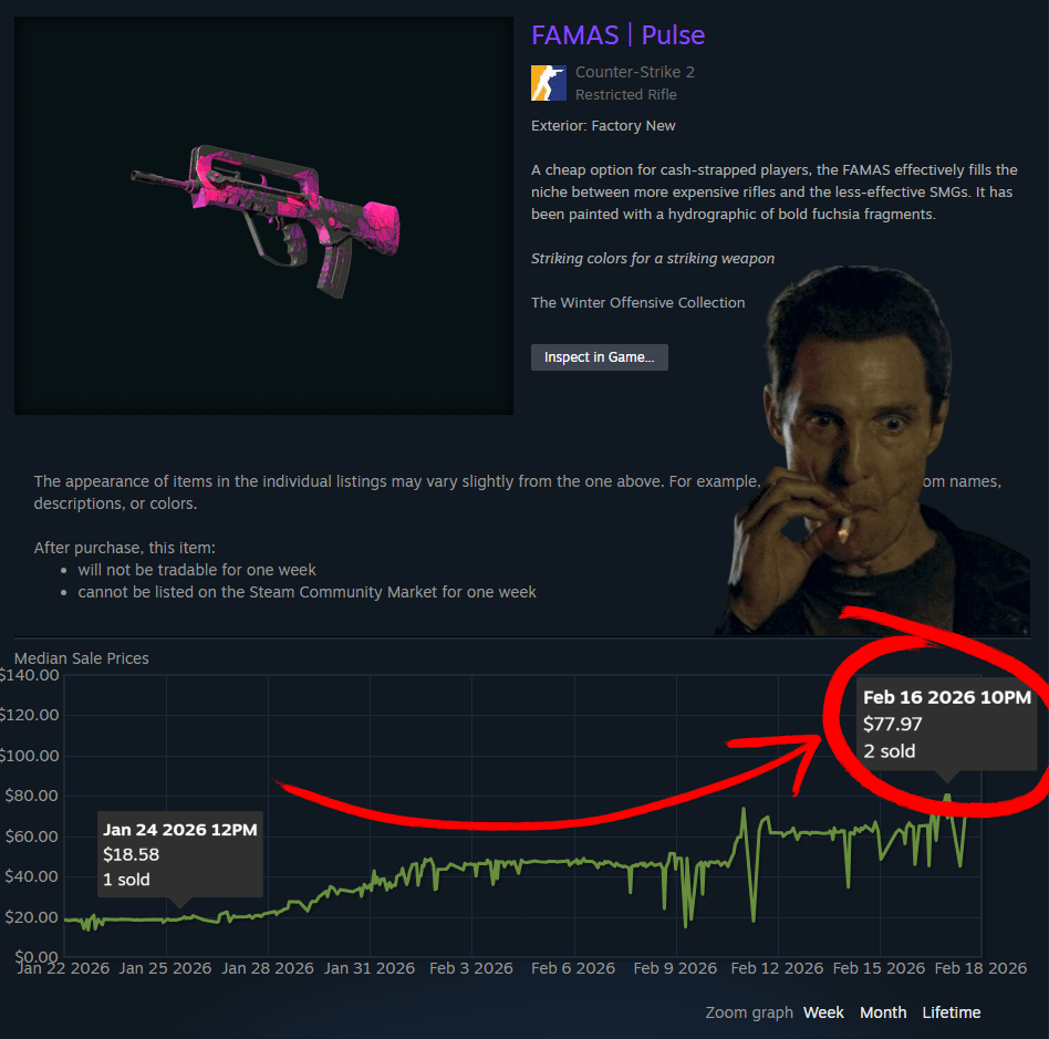 The FAMAS Pulse rally is insane. 📈January: $18Today: $78+That’s a 400% gain in weeks… counter strike 2cs2