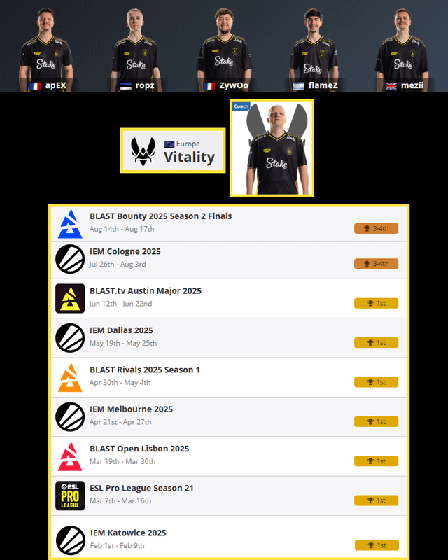 With their victory over Aurora, Vitality have secured yet another top 1-4th place for the 18th event in a row. The last time they finished out of top 4 was at BLAST Bounty 2025 Season 1 more than one year ago. Counter strikecounter strike global offensivecs:goGlobal offensive
