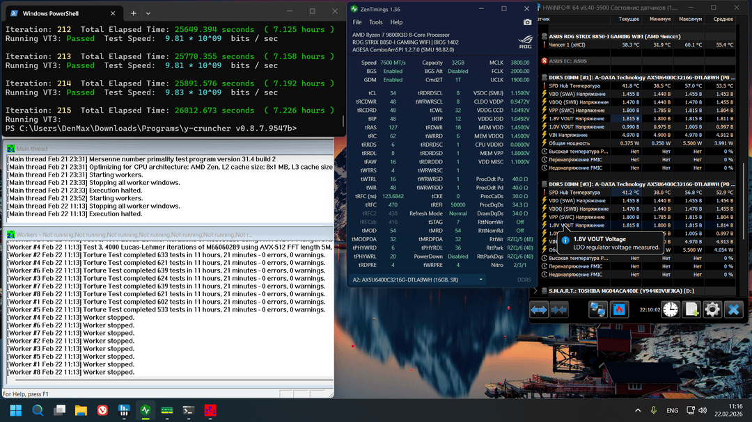 I thought maybe something in my build can't handle 8000, changed to 7800 – unstable. But at 7600 it was rock solid, and even at normal VDD at 1.45 I passed 3h Tm5, 7h VT3, 11h Prime95 Large. Even tried 1.4 VDD/VDDQ/VDDIO – 10 minutes of tm5 OK, I will be cheking this one later today.