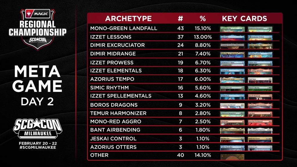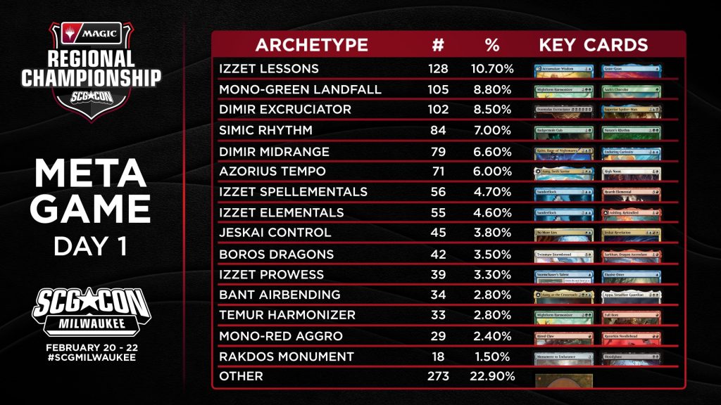 Izzet Lessons paced the Day-1 field as the only deck with a double-digit meta share percentage. Mono-Green Landfall wasn’t far behind and Dimir Excruciator joined those decks as the three archetypes with more than 100 pilots. Check out the Day 1 metagame breakdown of the 1,193 total players below.